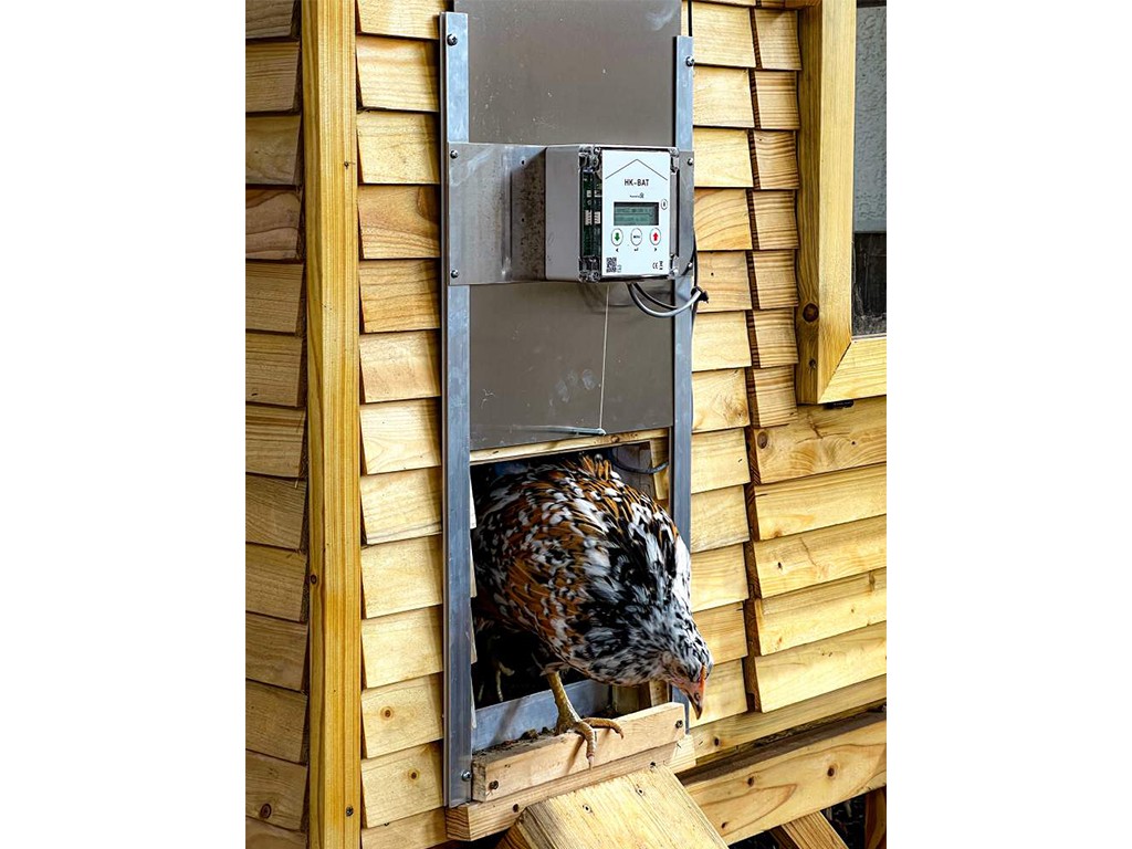 A tyúkól automatikus nyitása és zárása kerettel és 23x34 cm méretű biztonsági ajtóval . Ez egy komplett automatikus ajtómozgás-vezérlő rendszer fényérzékelővel , időzítővel és vésznyitó funkcióval. Az integrált LCD kijelző biztosítja az időzítés egyszerű beállítását és szükség esetén módosítását . -30°C- ig használható.