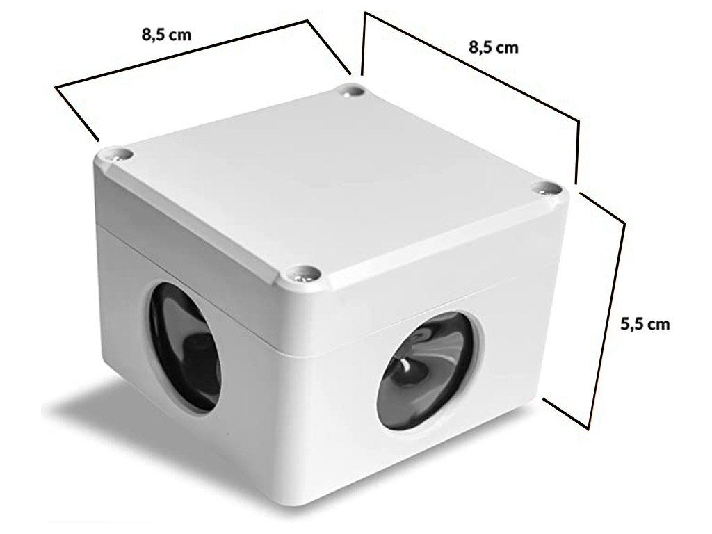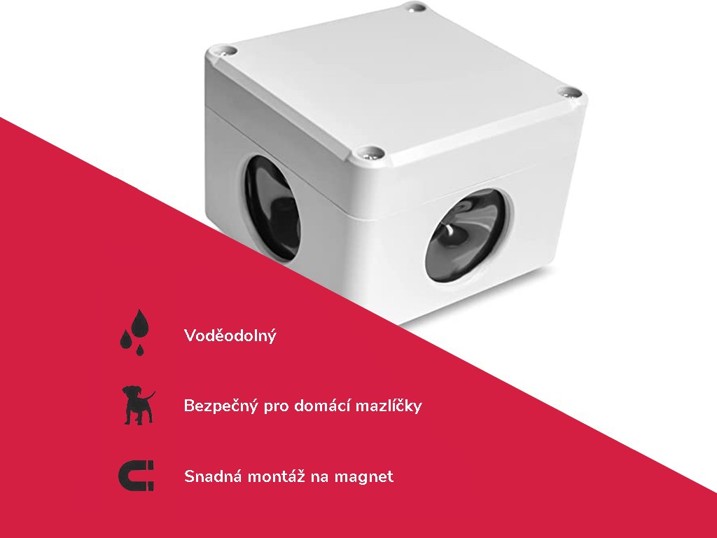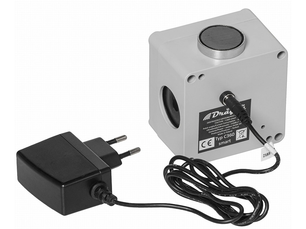 Ultrahangos vadriasztó nyestek és rágcsálók elriasztására , biztonságos ember és háziállatok számára. Beltéri és kültéri használatra, tartós, vízálló burkolattal ellátva, mágneses tartóval rögzíthető. Nyestriasztó 270° -os hangtartományú , automatikus frekvenciaváltással és akár 1500 m2 hatótávolsággal , 6 V-os adapterrel táplálva . A nyestriasztó 3 x 40 mm-es membrános hangszórót használ, az ultrahangos riasztó méretei 85x85x55 mm.