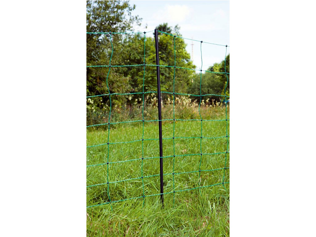 Vezetőképes kerítésháló juhoknak, villanypásztor építéséhez, 9 vízszintes szálból, megerősített felső szálból akár 6 dróttal, alsó szálból drót nélkül, további vízszintes szálakból 3 drót, 14 műanyag rúd dupla végekkel , szorosan hegesztett illesztésekkel és tartós ütközőkkel, magasság 90 cm és hossza 50 m.