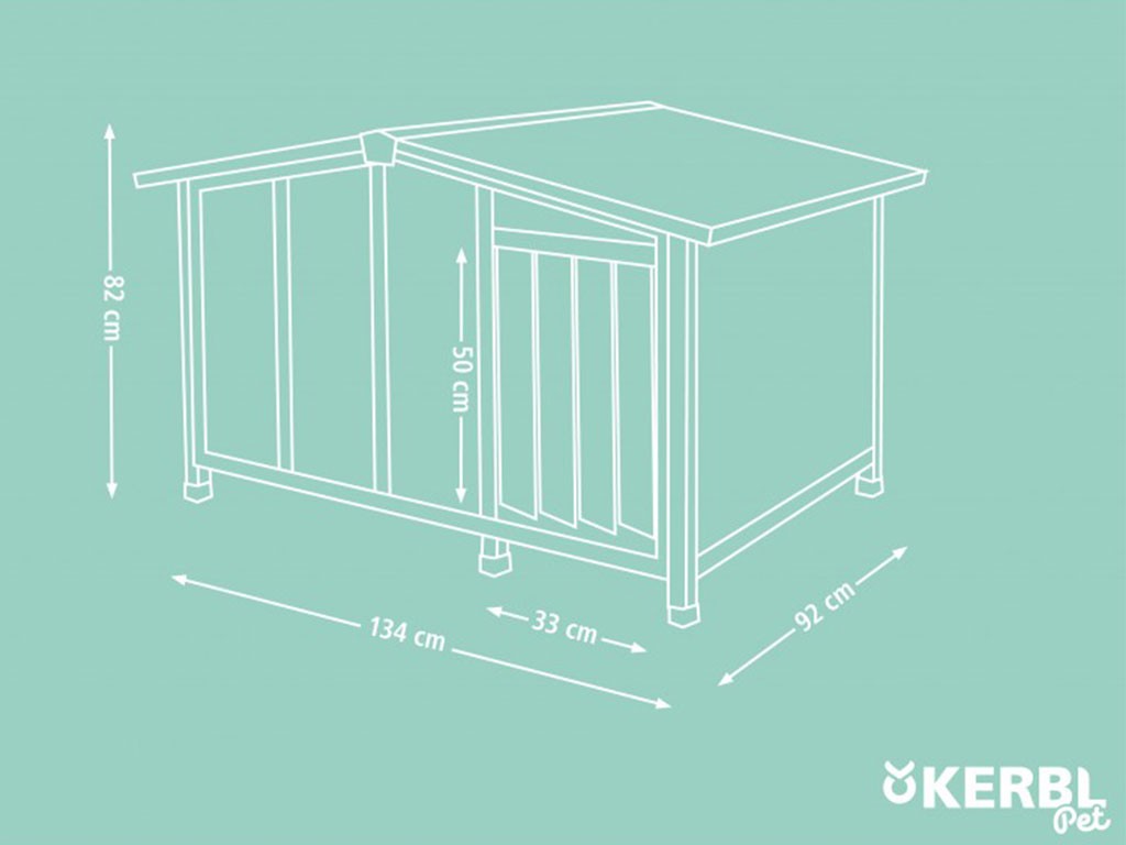 A kutyaház teljes külső méretei 134x92x82 cm.
