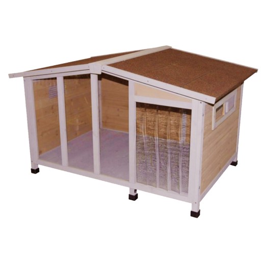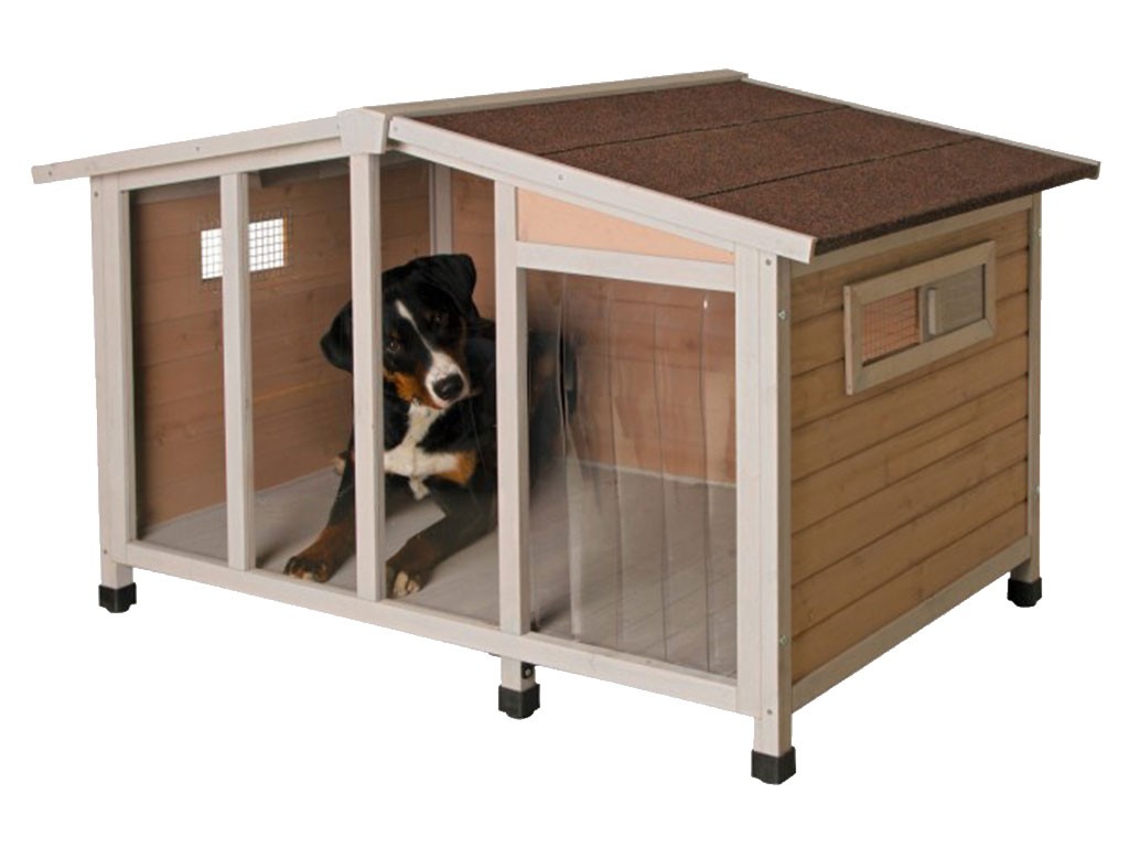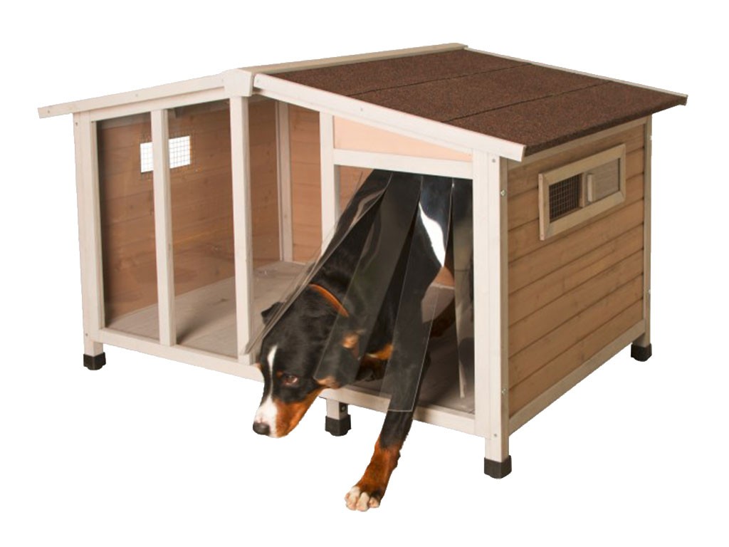 - A kutyaház bejárata kellően tágas , és egy léces függöny védi a szél és a rossz időjárás ellen. A bejárat elég tágas ahhoz, hogy a kutya kényelmesen ki- és be tudjon menni a kennelbe.