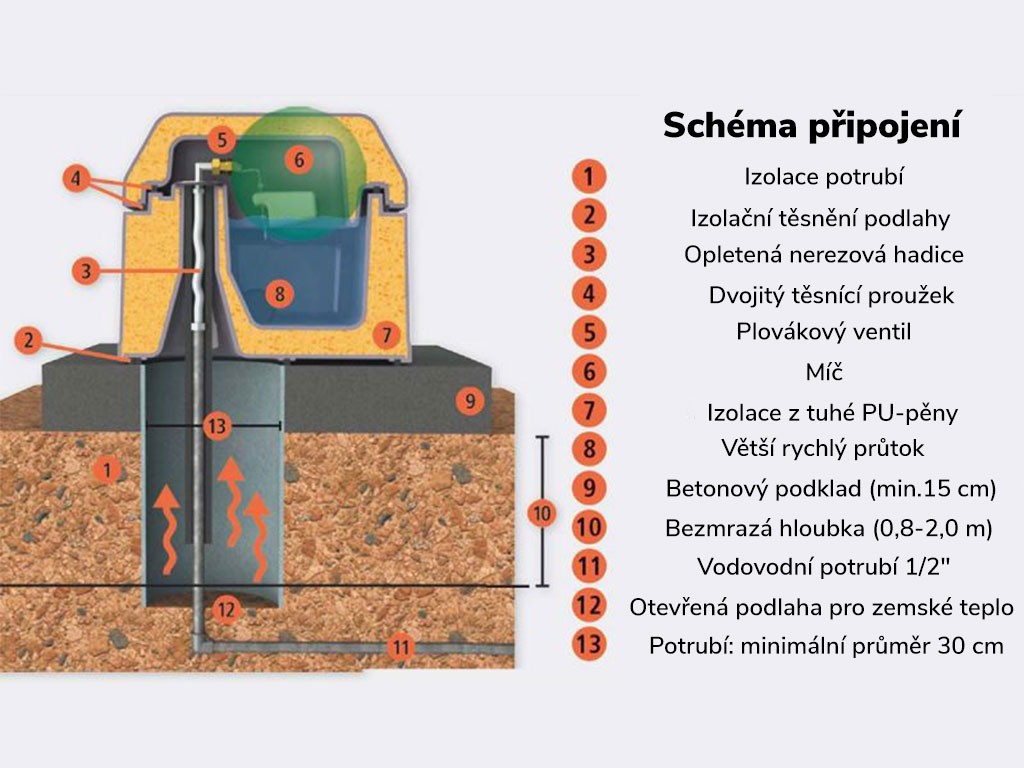 Javasoljuk, hogy a golyós etetőt az utasításoknak megfelelően telepítse, ami biztosítja az etető megfelelő működését mind téli, mind nyári hónapokban. Ez a golyós etető úgy van kialakítva, hogy ne kelljen az elektromos hálózathoz csatlakoztatni. A víz hőmérsékletét a csöveken átáramló víz, a geotermikus hő és az etető dupla habszigetelése tartja nulla fok felett .
