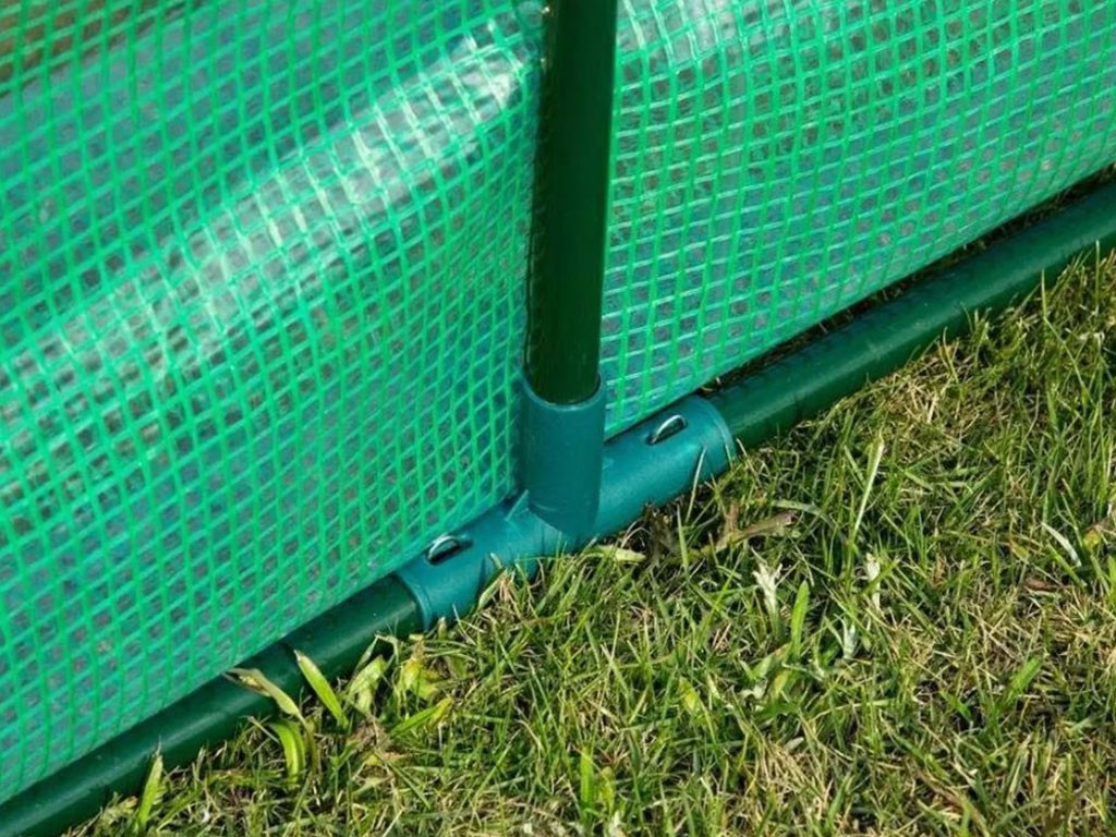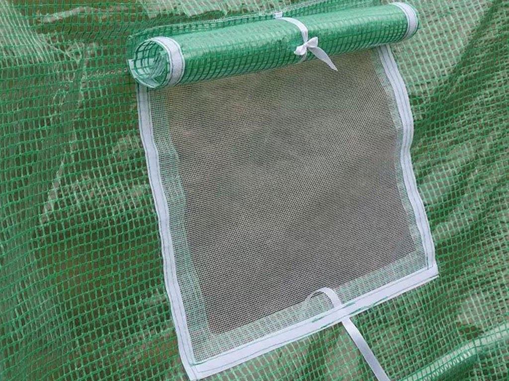 Az üvegház praktikus zöld ponyvája üvegszálas polietilén vászonból készült, 140g/m2 áteresztőképességgel. Az üvegház szerkezete 25 mm átmérőjű fémrudakból áll. Az összeszerelés igazán egyszerű és gyors, a szerkezet egyszerűen egymásba pattintható, a ponyvát kifeszítik és rögzítik, az egész üvegház pedig a talajhoz van rögzítve. A szellőzés biztosítása érdekében az üvegház 6 szellőzőablakkal rendelkezik, amelyek szükség szerint zárhatók vagy nyithatók, és zsinórokkal rögzíthetők. Az üvegház tágas ajtaja feltekerhető, és felül zsinórokkal rögzíthető .
