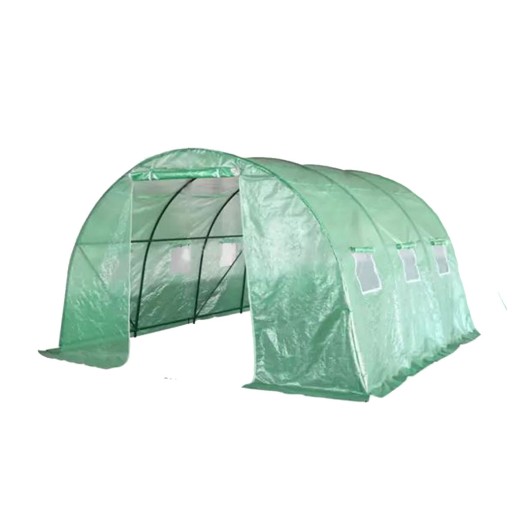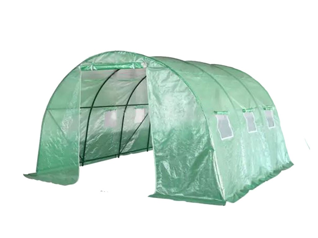 Fóliaüvegház növények termesztéséhez, zöld fólia 140g/m2 áteresztőképességgel, üvegszálak / polietilén / fém, 25 mm átmérőjű rudak, 6 szellőzőablak az oldalán, 9 m2-es fóliafelület , méretek 300x300x200 cm.