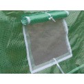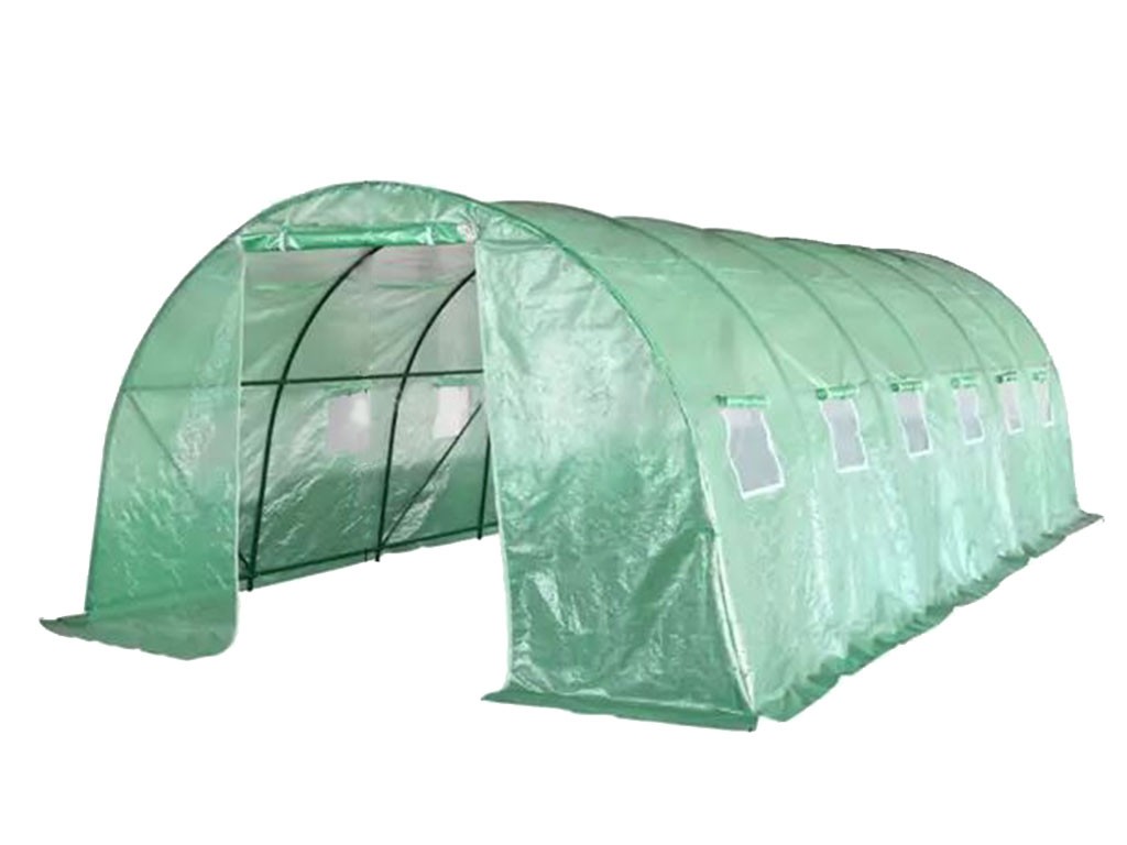 Fóliaüvegház növények termesztéséhez, zöld fólia 140g/m2 áteresztőképességgel, üvegszálak / polietilén / fém, 25 mm átmérőjű rudak, 12 szellőzőablak az oldalán, fóliaüvegház területe 18 m2, méretek 600x300x200 cm.