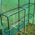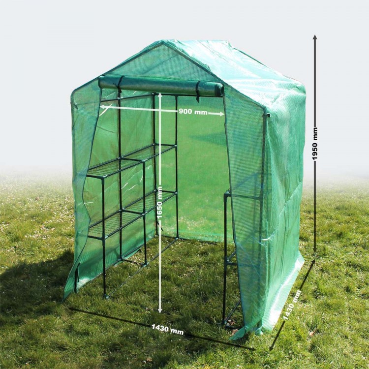 Ez az üvegház rengeteg helyet kínál több növény számára is a 143 x 143 x 195 cm- es méreteinek köszönhetően . Az eleje cipzárral nyitható és zárható, így a növények anélkül férhetnek hozzá az üvegházhoz, hogy a kedvezőtlen időjárási körülmények túlságosan igénybe vennék őket. Az üvegházban 8 polc található. A fémpolcok rengeteg helyet biztosítanak a virágcserepek és kerti szerszámok megfelelő elhelyezéséhez.