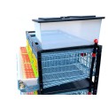 Az összecsukható ötszintes fürjketrec méretei , kerekekkel, víztartállyal, etetőkkel és tojótyúkkal együtt , 98 x 62 x 196 cm.