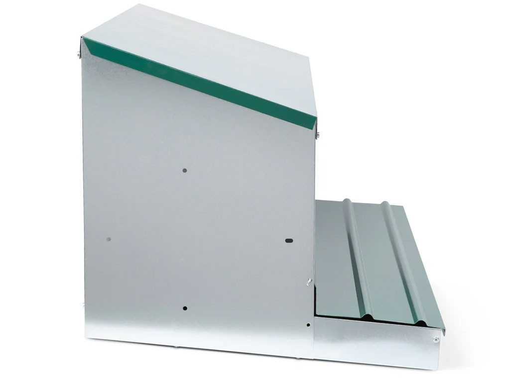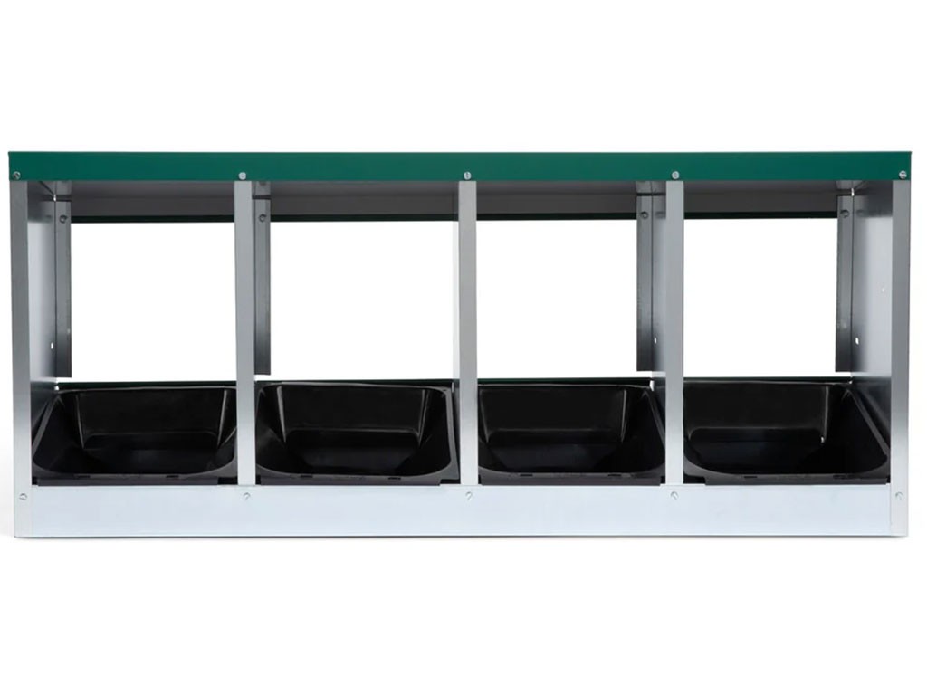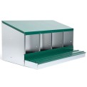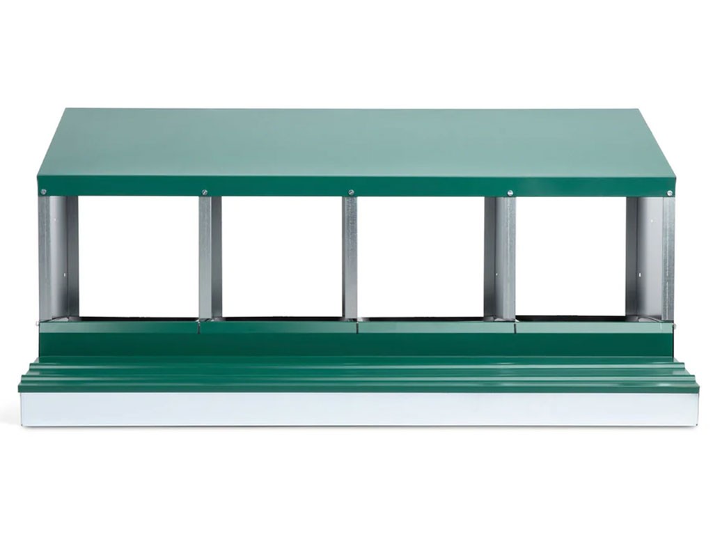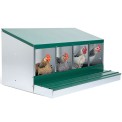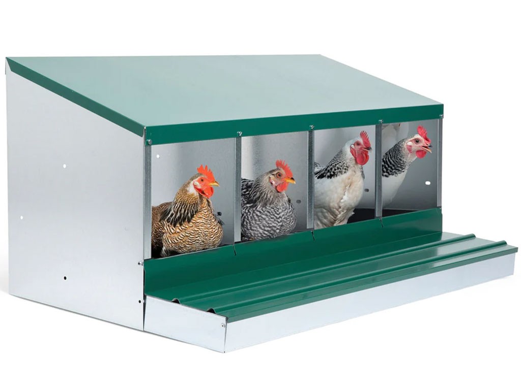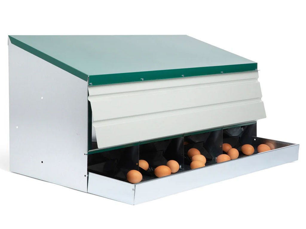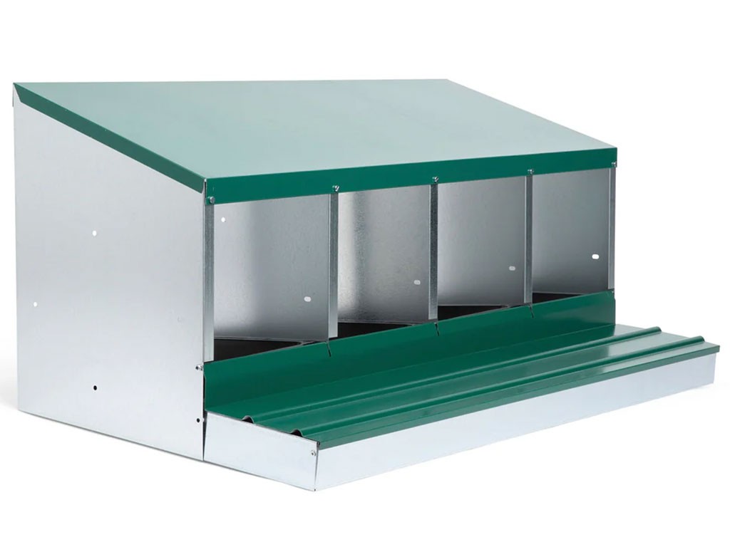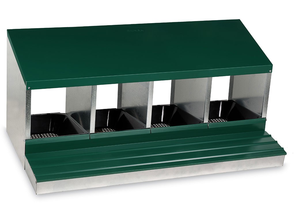 Tojófészek tyúkoknak tojásgyűjtő kosárral, négy férőhelyes , kapacitása akár 20 tojótyúk (5 tojótyúk keltetőnként), a fészek alja lejtős, a tojások maguktól gurulnak a gyűjtőkosárba , horganyzott fémből készült, zöld színű. A fészket egyszerűen elhelyezheti a tyúkól földjén, vagy felakaszthatja a falra , nagyon könnyen tisztítható , méretei: 56 cm hosszúság x 106,3 cm szélesség x 45,5 cm magasság.