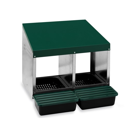 Tojófészek tyúkoknak tojásgyűjtő kosárral, két férőhelyes , kapacitása akár 10 tojótyúk (5 tojótyúk keltetőnként), a fészek alja lejtős, a tojások maguktól gurulnak a gyűjtőkosárba , horganyzott fémből készült, műanyag aljjal, zöld színű. A fészket egyszerűen elhelyezheti a tyúkól földjén, vagy felakaszthatja a falra , nagyon könnyen tisztítható , méretei: 48 cm hosszúság x 53,2 cm szélesség x 52 cm magasság.