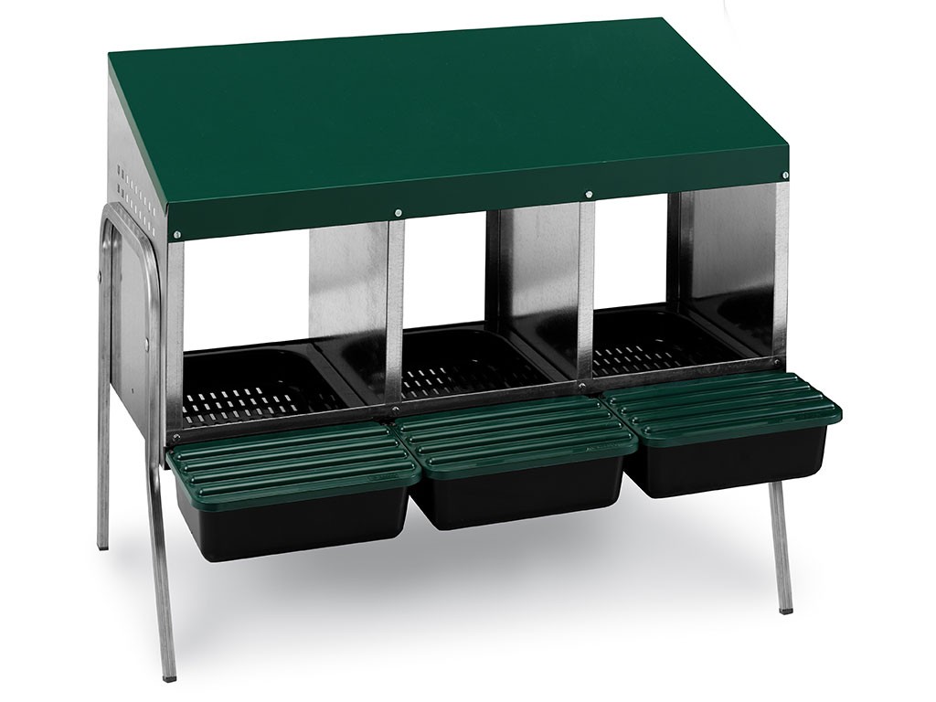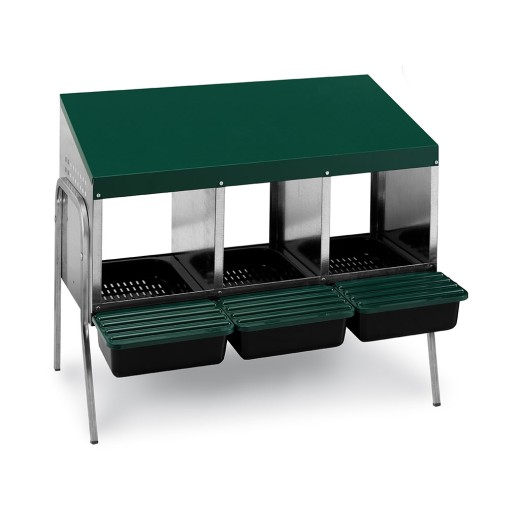 Tojófészek tyúkoknak tojásgyűjtő kosárral, három férőhelyes , kapacitása akár 15 tojótyúk (5 tojótyúk ólanként), a fészek alja lejtős, a tojások maguktól gurulnak a gyűjtőkosárba , horganyzott fémből készült, műanyag aljjal, zöld színű. A fészket egyszerűen a tyúkól földjére helyezheti , nagyon könnyen tisztítható , méretei: 83,7 cm hosszúság x 52 cm szélesség x 66,5 cm magasság.