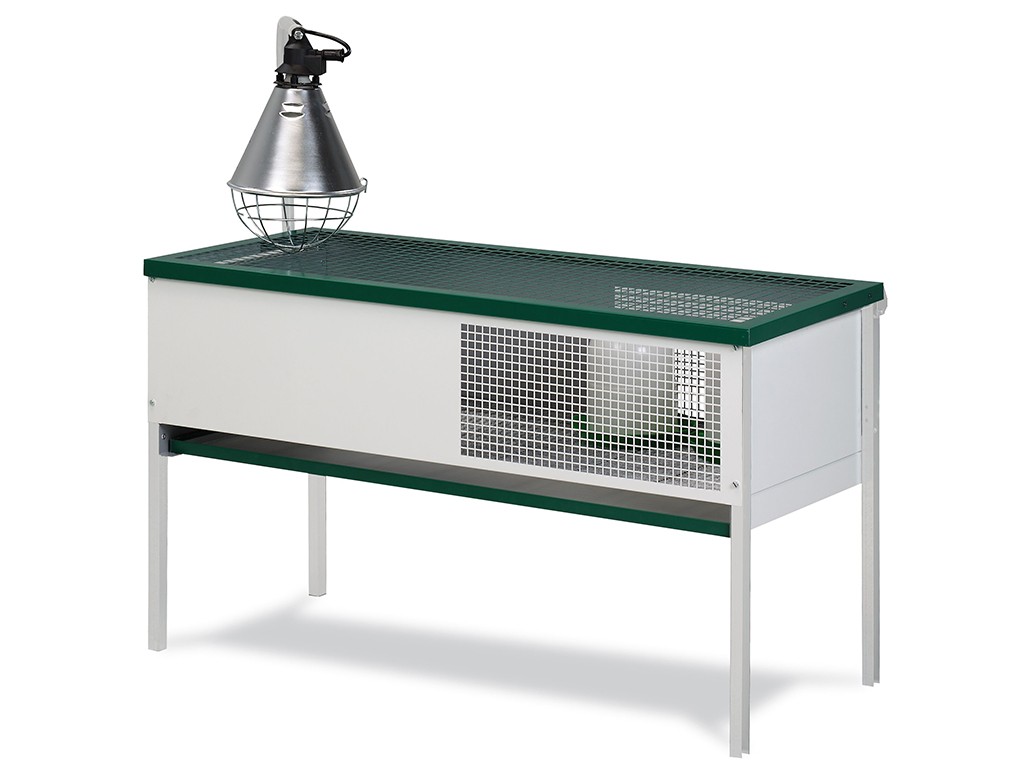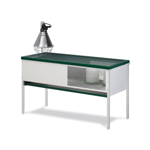 Baromfinevelő istálló 30-35 csirke tenyésztésére alkalmas , méretei 102,7 x 47,7 x 96,5 cm . Ez egy komplett négyzet alakú nevelőistálló, amely infravörös izzóval ellátott alumínium lámpával, 2 literes itatóval és 2 kg-os etetővel van felszerelve.