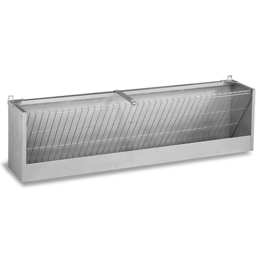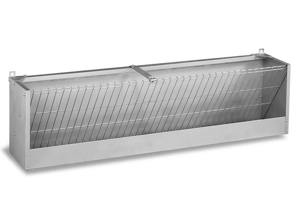 Szénatároló juhoknak és kecskéknek, horganyzott lemezből, hátfallal, falra szerelhető, gyűjtőtálcával, méretei 200x36x52 cm.