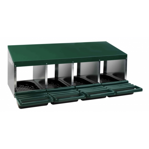 A fészek lejtős aljú, ami biztosítja, hogy a tojások maguktól leguruljanak a gyűjtőkosárba. Ez azt jelenti, hogy a tiszta és sértetlen tojásokat könnyen eltávolíthatja. A fészek csavarokkal könnyen felszerelhető a falra, és szükség esetén tisztítás céljából könnyen levehető a falról. Létezik lábas változat is (10107-es modell) .
