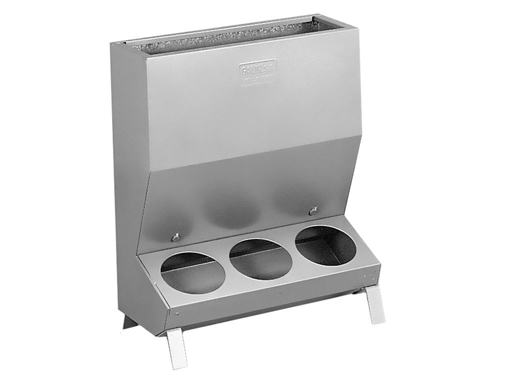 Malacoknak való etető, háromállásos, garatos, horganyzott lemezből készült, állítható etetőnyílással , 25 kg takarmány befogadására alkalmas garat , méretek 46x24x54 cm.