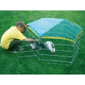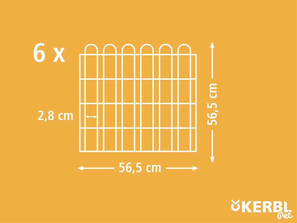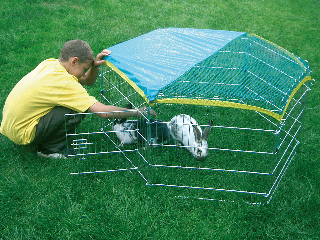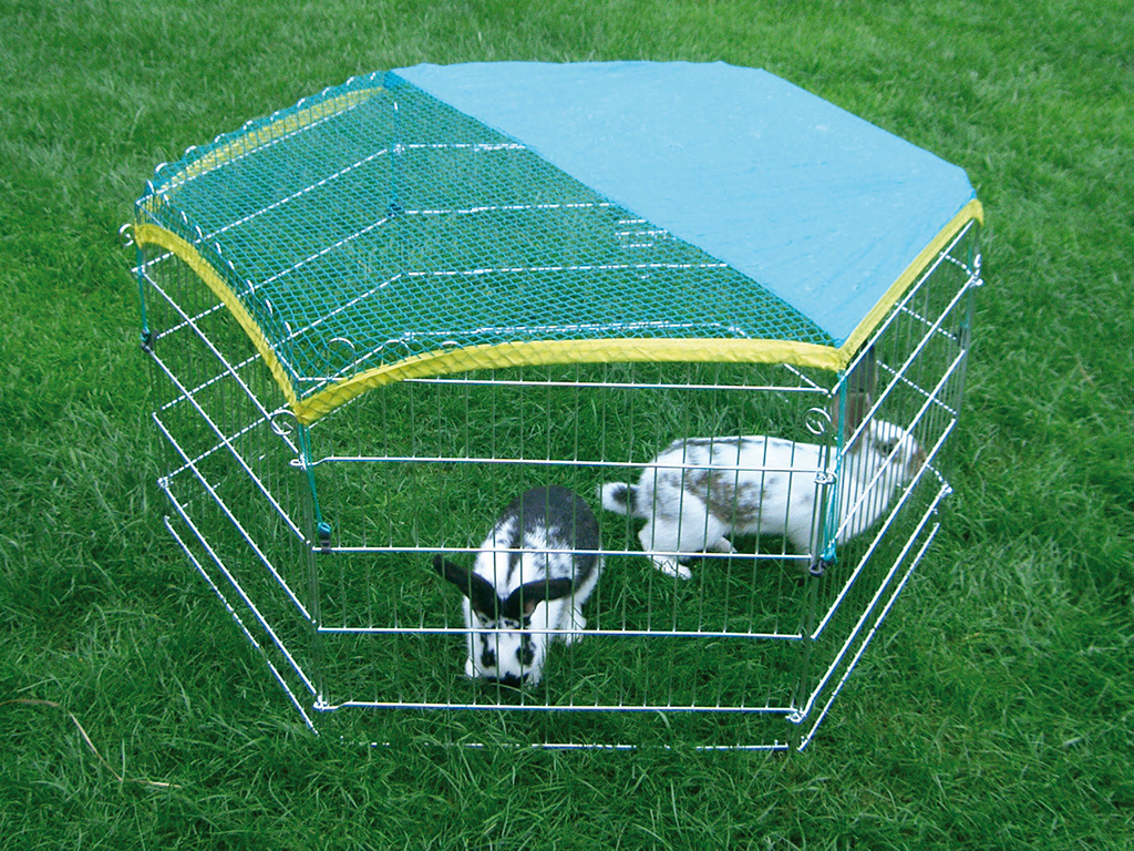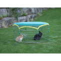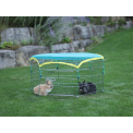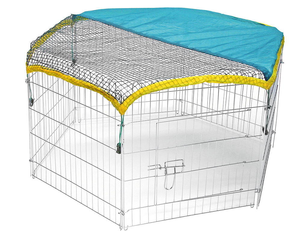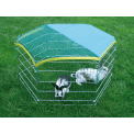 Kifutó nyulaknak vagy más rágcsálóknak , hat fallal, 56,5 x 56,5 cm méretekkel. Ez egy praktikus játszókarám ajtóval , napvédő ponyvával és védőhálóval a kis állatok számára. A játszókarám könnyen összecsukható és kinyitható, horganyzott fémből készült .