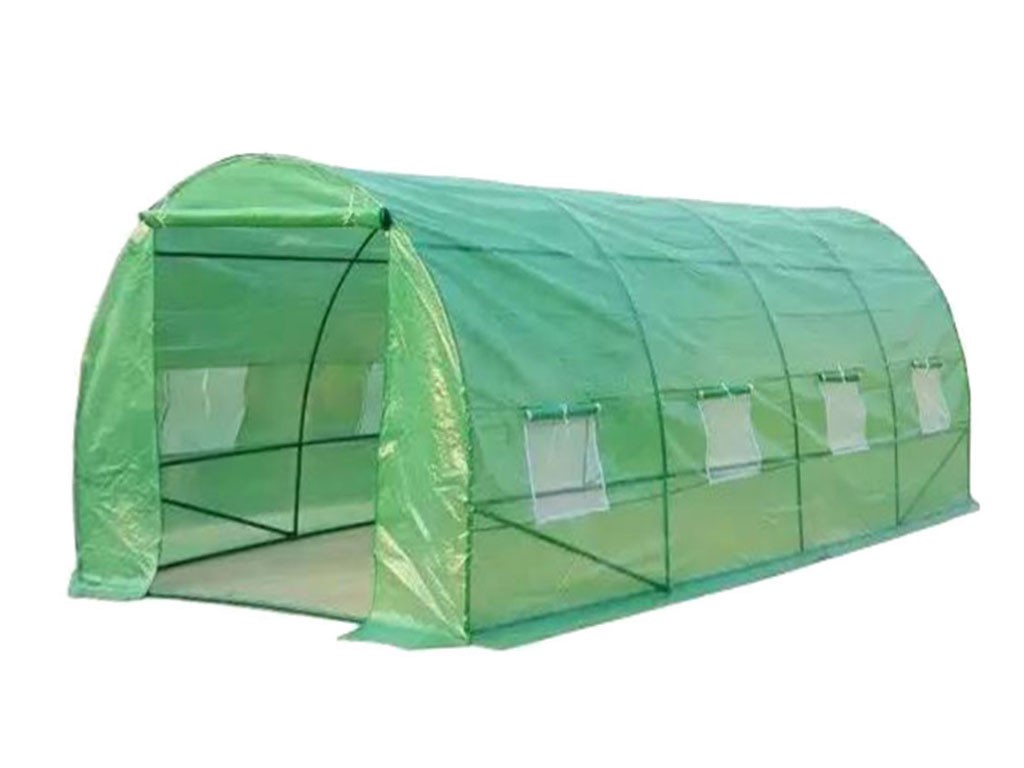 Fóliaüvegház növények termesztéséhez, zöld fólia 140g/m2 áteresztőképességgel, üvegszálak / polietilén / fém, 25 mm átmérőjű rudak, 8 szellőzőablak az oldalán, 9 m2-es fóliaüvegház , méretek 450x200x200 cm.