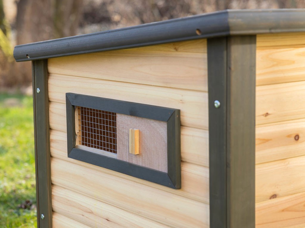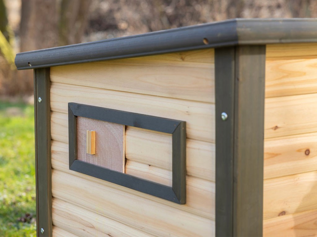 Kacsa- és libaház, tartós lucfenyőből készült, a lábak nagy stabilitást biztosítanak, zárható ajtóval, oldalsó ablakkal, kihúzható ürülékkel könnyen tisztítható, méretek 115x77x67 cm.