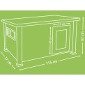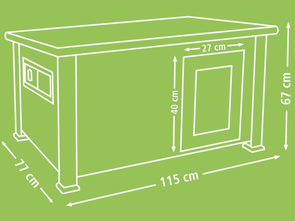 A kacsaház külső méretei 115x77x67 cm, így elegendő helyet biztosít a kacsáknak és libáknak. A kacsaház ajtajának méretei 27x40 cm.