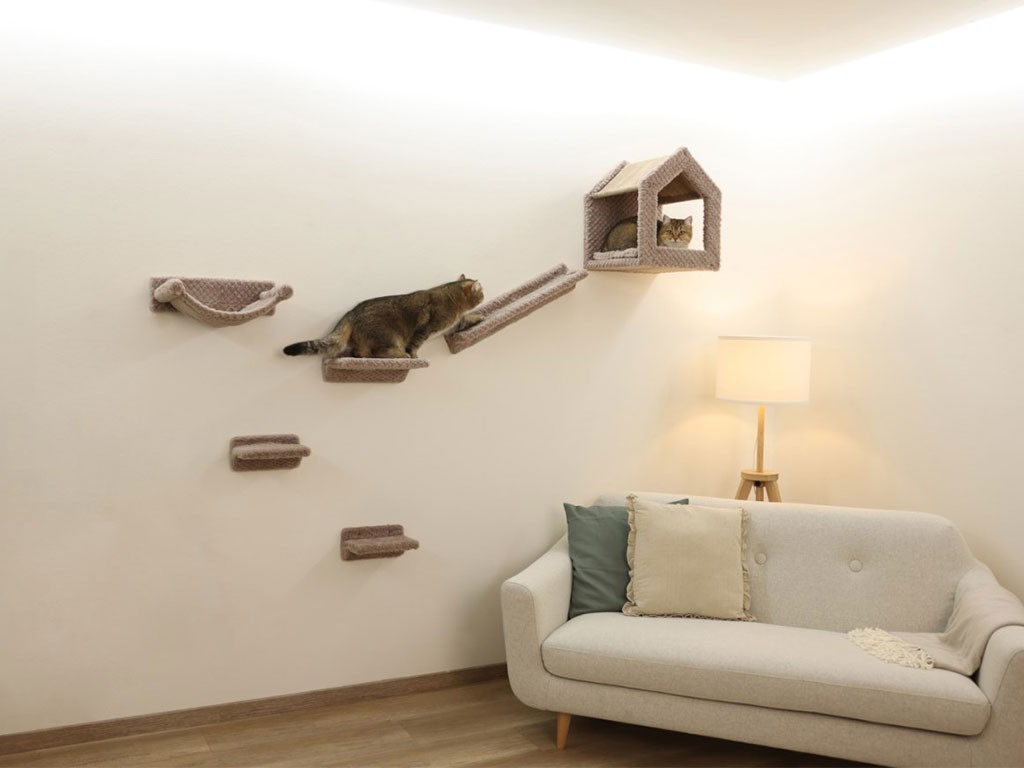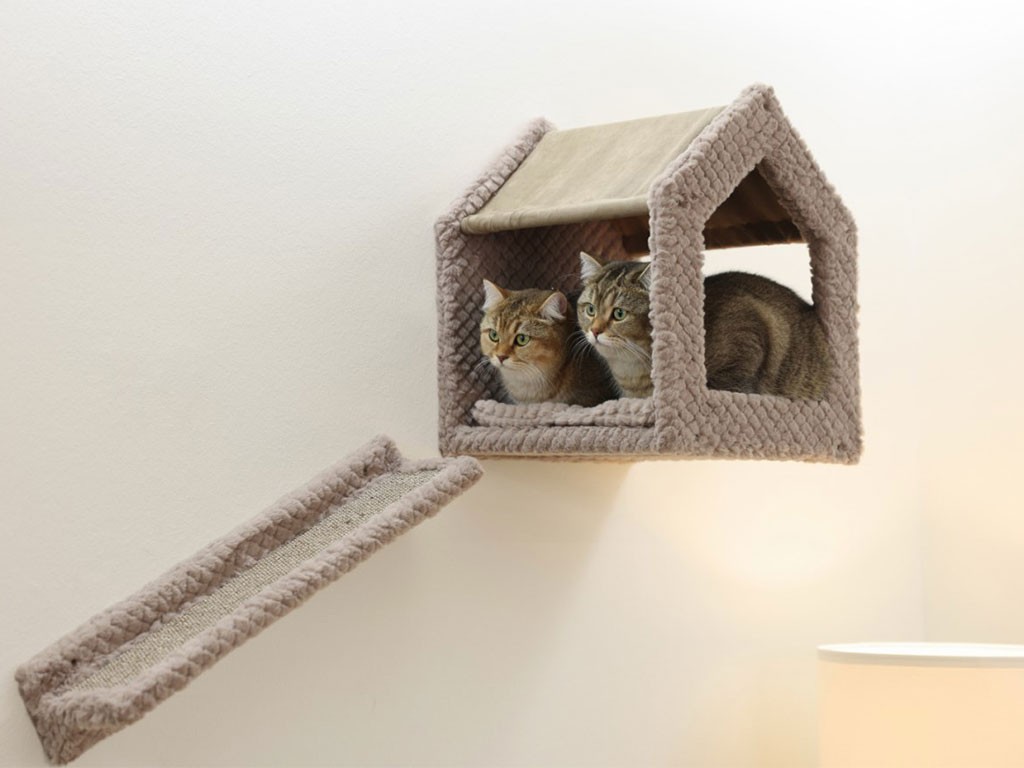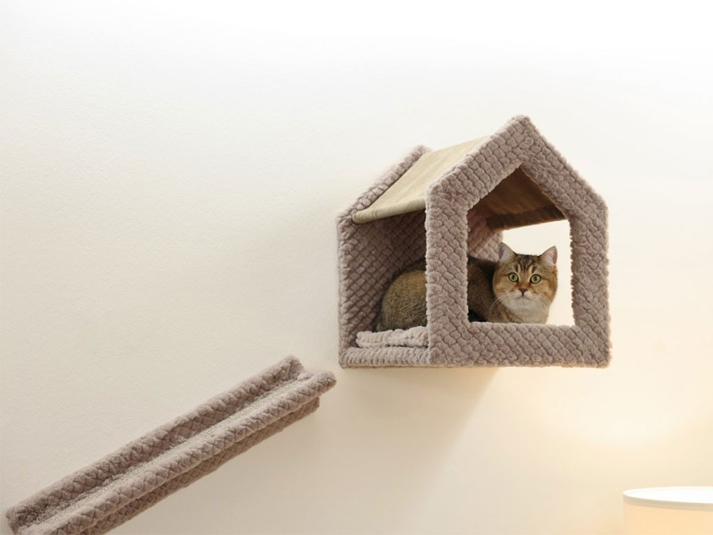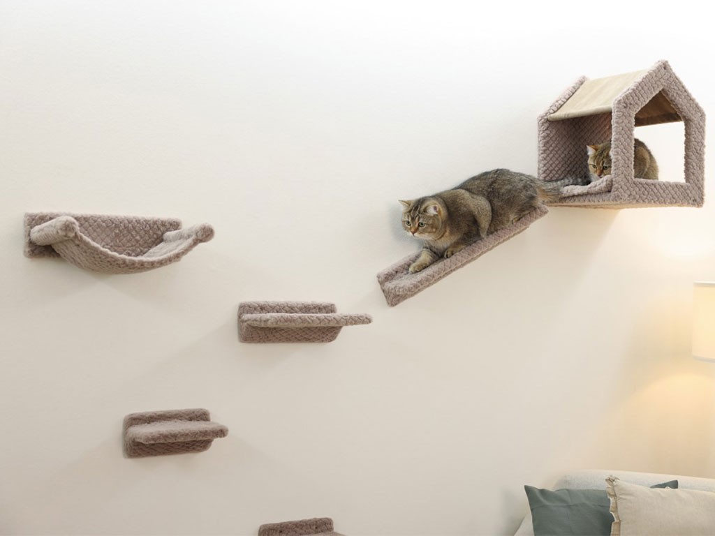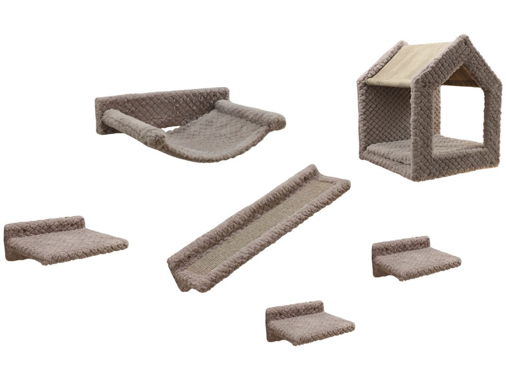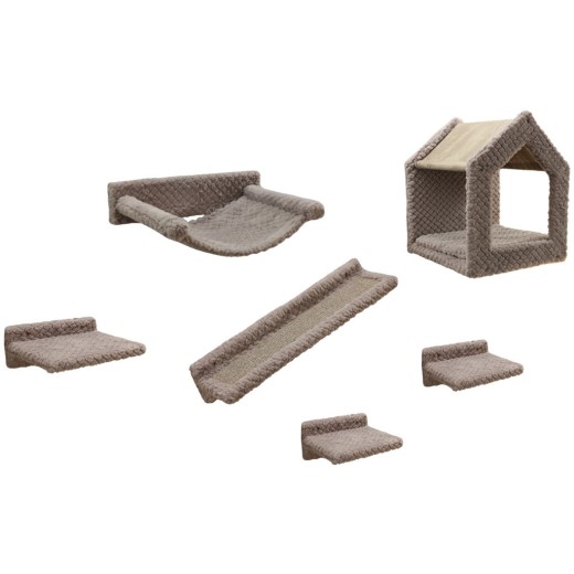 A falra szerelhető macskafa összesen hat részből áll , amelyeket a rendelkezésre álló hely függvényében a falra szerelhetsz . A falra rögzítéshez szükséges alkatrészek a csomagban találhatók . A macskafa tartalmaz egy tágas, 38x38x45 cm-es házikót , két 23x14 cm- es mászókát , egy 31x21 cm-es teraszdeszkát , egy 39x27 cm-es függőágyat és egy 58x14 cm- es szizál szőnyeggel borított rámpát . Minden más rész puha poliészter plüsssel van bevonva .
