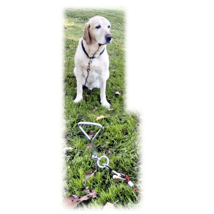 Rögzítőhorgony és kutyapóráz kerti használatra. A krómozott cöveket egyszerűen a talajba kell fúrni, a kábelt (zsinórt) pedig karabinerrel rögzíteni a horgonyhoz . Nyílt területekre alkalmas. Max. 30 kg-os kutyák számára.