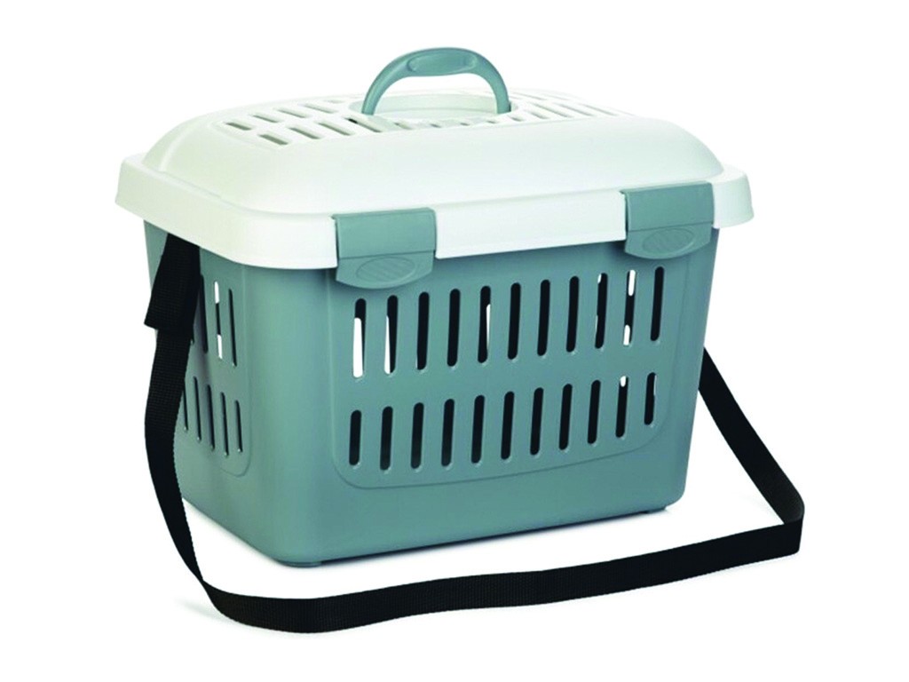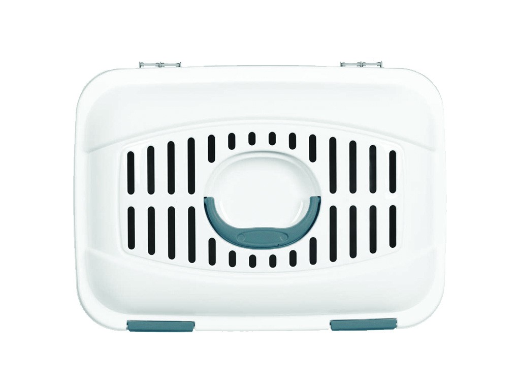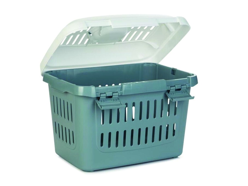 Nyulaknak, macskáknak és kutyáknak 5 kg-ig, zsanéros fedél két klipsszel, szellőzőnyílásokkal ellátott fedél és falak, fogantyú és pánt a könnyű hordozáshoz , belső méretek 42x28x31cm, külső méretek 45x33x33cm.