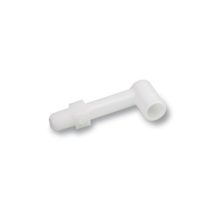 Derékszögű toldó rozsdamentes acél szopókához - nyulakhoz, baromfihoz, tyúkokhoz, fürjekhez - a szopókához vezető műanyag könyök belső menettel, M10x1 mm-essel végződik, amelybe a szopókát becsavarják, a másik oldalon pedig külső menettel, amely a tartályba csavarozható.