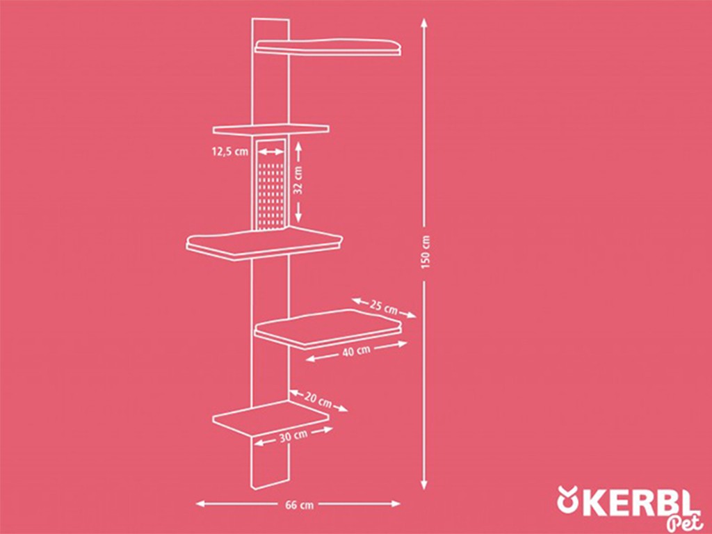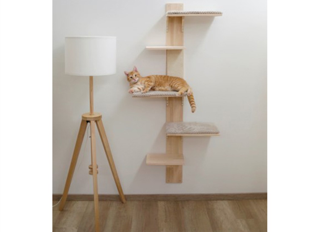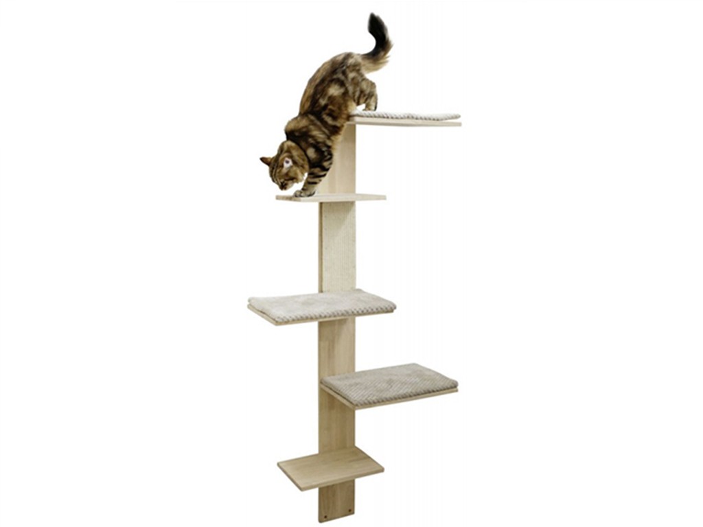 A falra szerelhető macskafa tömör fából készült , a fekvőfelületek bézs színű, levehető párnákkal vannak ellátva . A macskafa magassága 150 cm, és falra szerelhető . A falra rögzítéshez szükséges alkatrészek a csomagban találhatók.