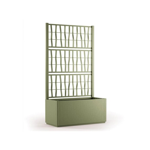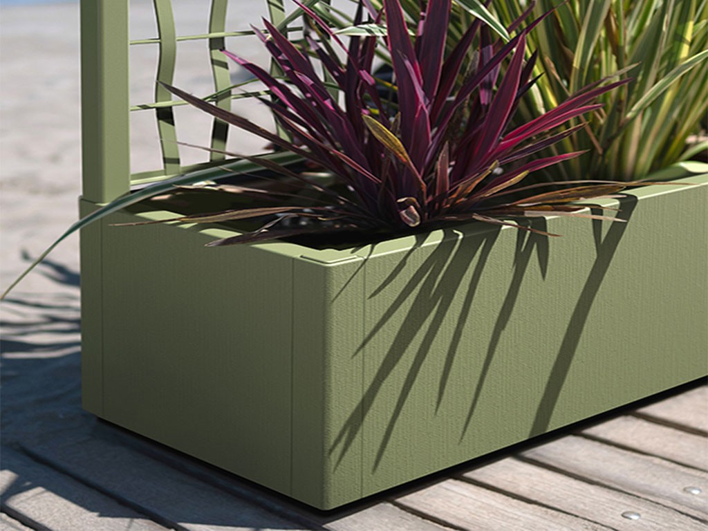 Doboz ráccsal, vízelvezető aljjal, kültéri használatra, polipropilénből készült, olívazöld színű, 80 literes űrtartalommal, méretek 80x36x142cm.
