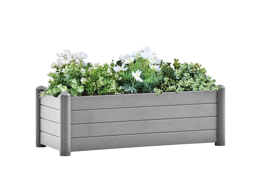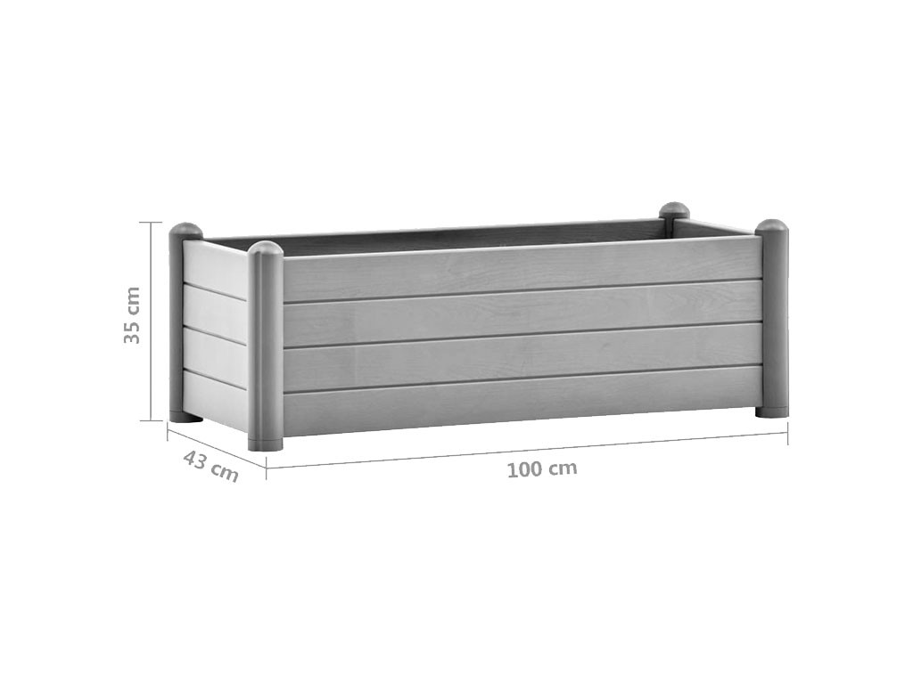 Vízelvezető aljú doboz, kültéri használatra, polipropilénből készült, szürke színű, 80 literes űrtartalommal, méretek 100x43x35cm.
