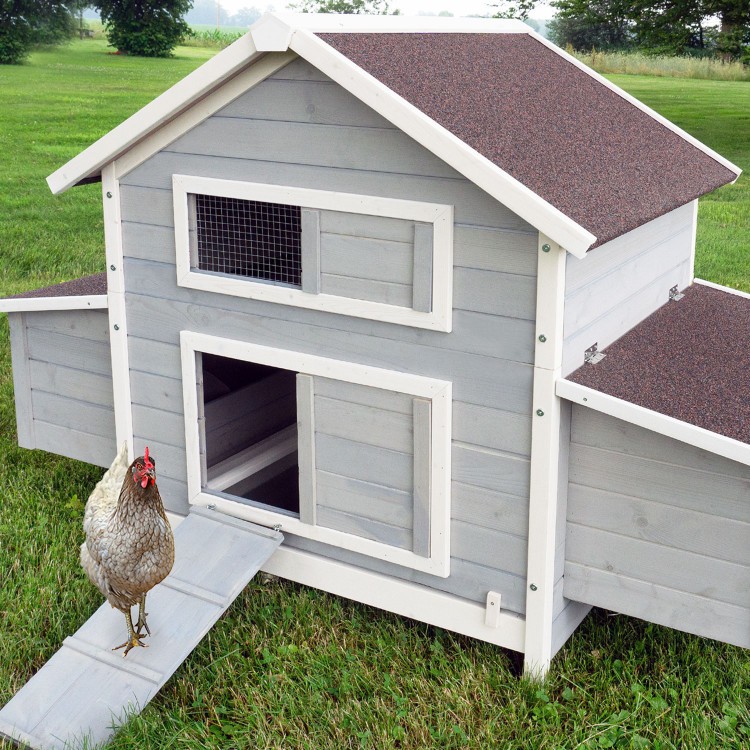 A tyúkok egy tolóajtós rámpán keresztül tudnak ki- és bejutni az ólba. Az ól kiváló minőségű fából készült. A fát modern és környezetbarát festékekkel festették.