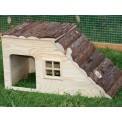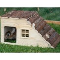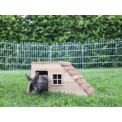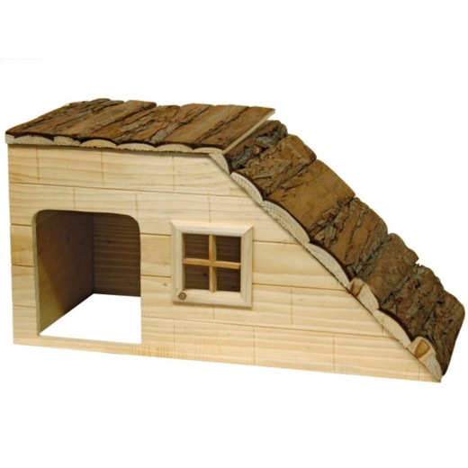 Természetes fából készült ház nyulaknak, tengerimalacoknak, hörcsögöknek, csincsilláknak és hörcsögöknek , rámpával és tetőkilátással. A ház alkalmas ketrecbe vagy kültéri kifutóként , méretei 50x25x25 cm.