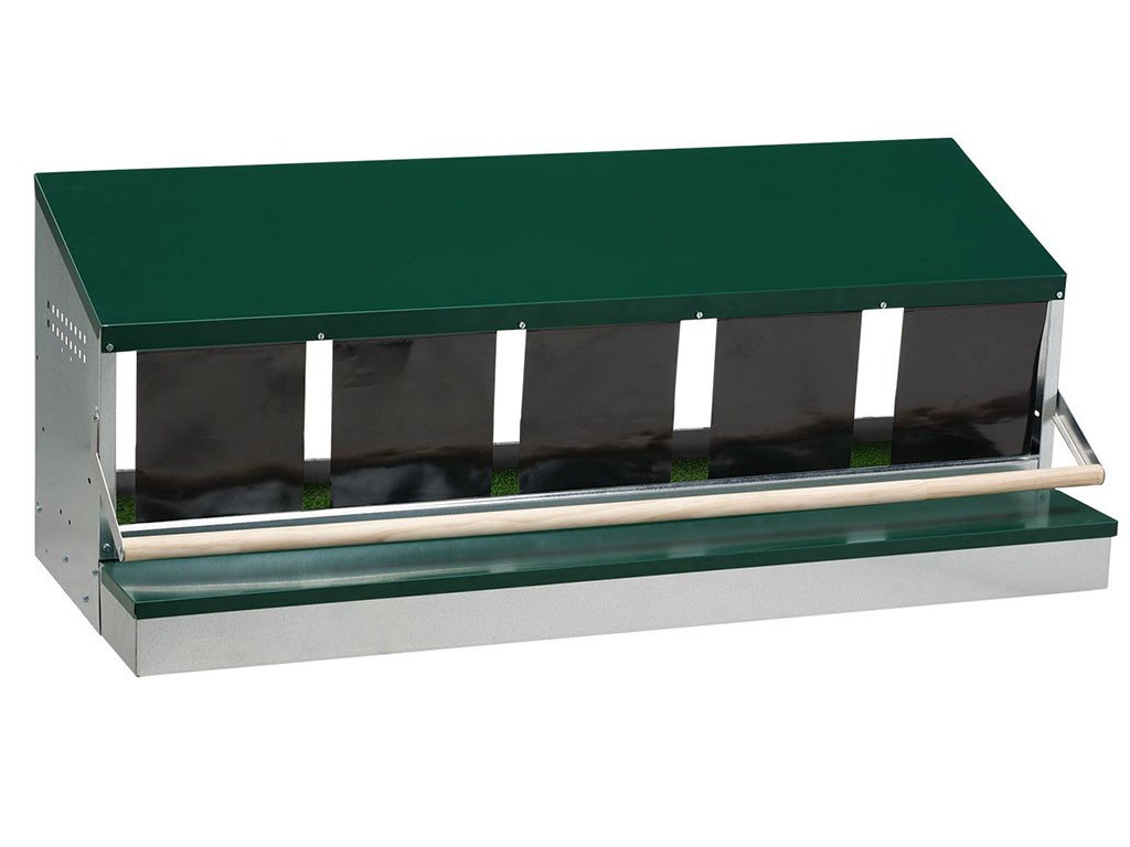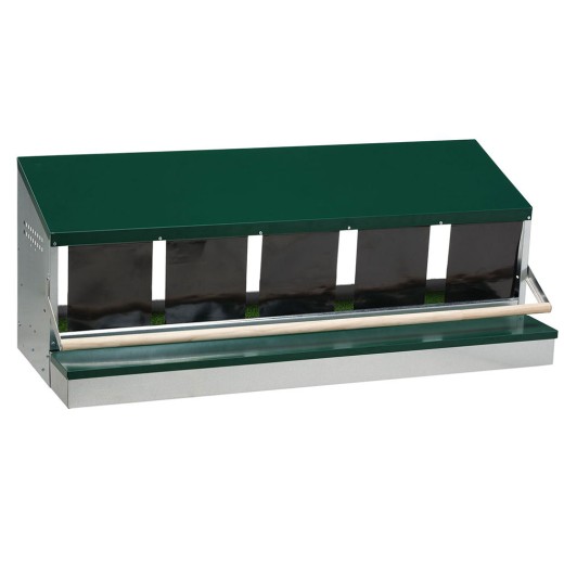 Tyúkoknak való tojófészek ülőrudával és gyűjtőkosárral, öt férőhelyes , akár 25 tojótyúk befogadására alkalmas (5 tojótyúk ólonként), tartós fémből és műanyagból készült, zöld színű. A fészket egyszerűen a tyúkól földjére helyezheti , vagy a falra is felakaszthatja , nagyon könnyen tisztítható , méretei: 51,5 cm hosszúság x 132,4 cm szélesség x 51 cm magasság.