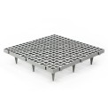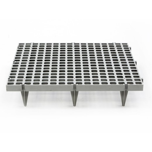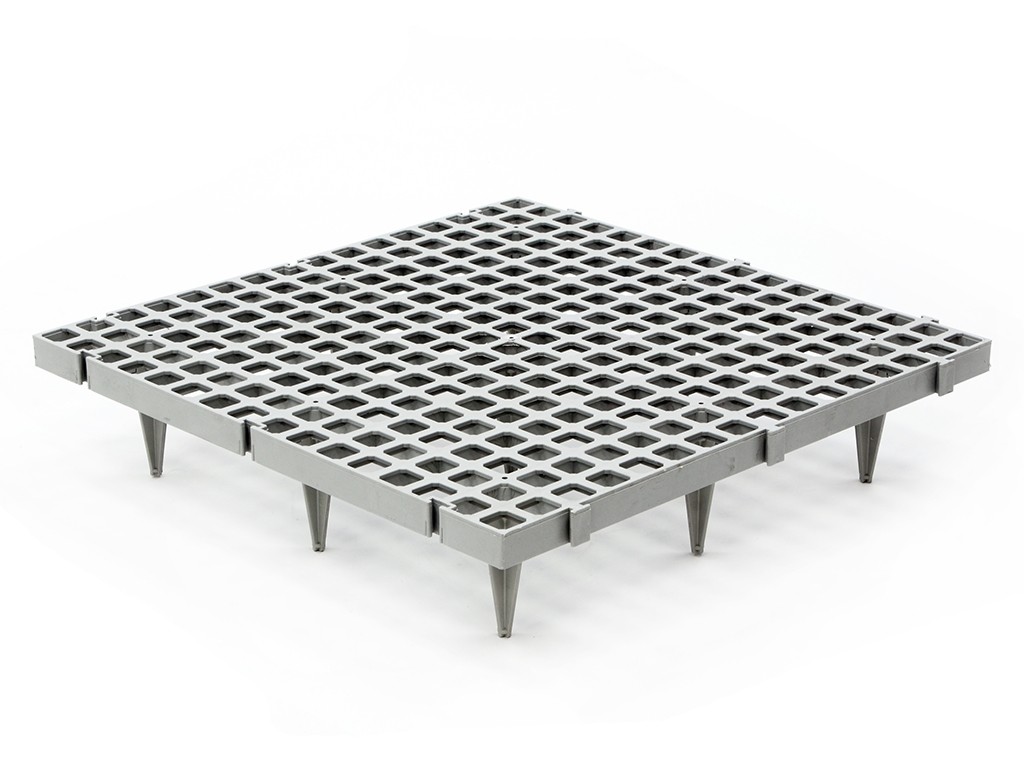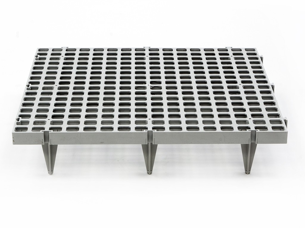 50x50x11 cm méretű, 2,2x2,2 cm-es lyukakkal ellátott , műanyag összecsukható padlórács . A folyadékok és szennyeződések elvezetését lehetővé tevő lyukaknak köszönhetően a padlórács higiénikus környezetet biztosít. A műanyag lapok biztonságos tartást, csúszásmentes felületet , könnyű karbantartást, nagy teherbírást és hosszú élettartamot biztosítanak. A padlórács színe csak tájékoztató jellegű , fehér is kérhető.