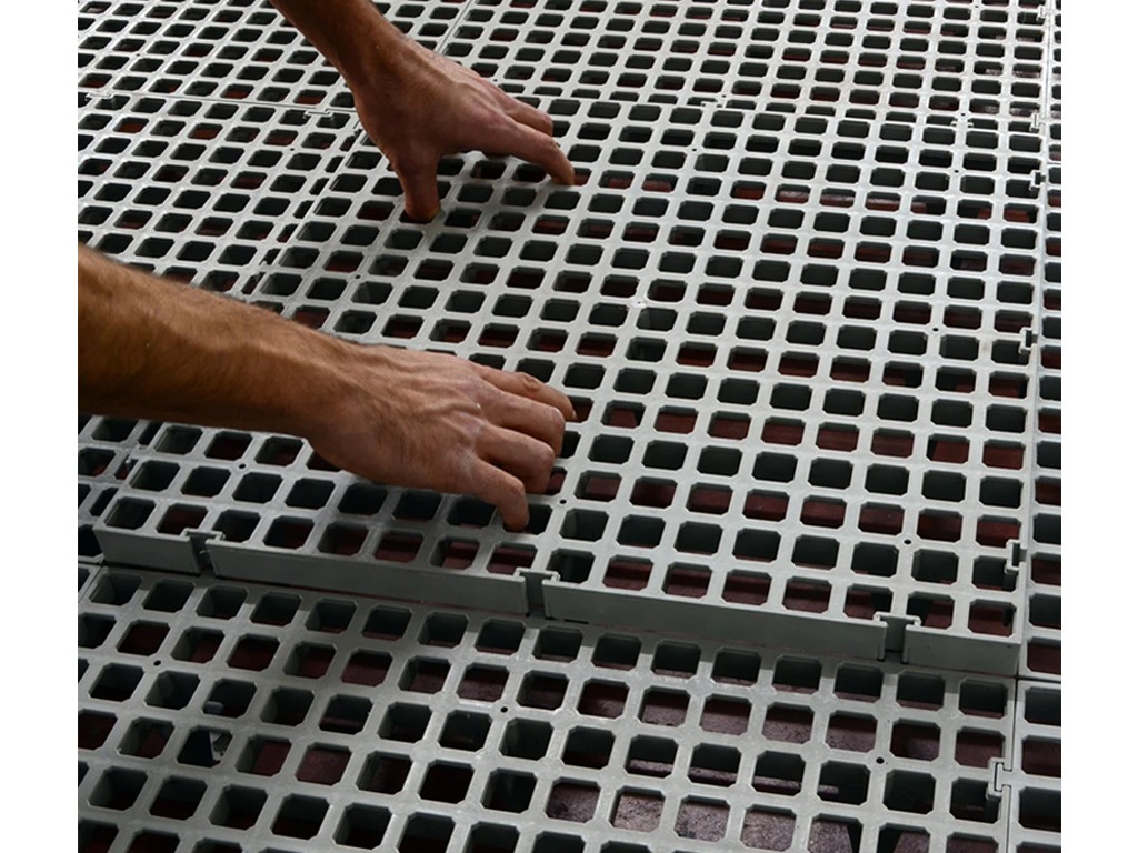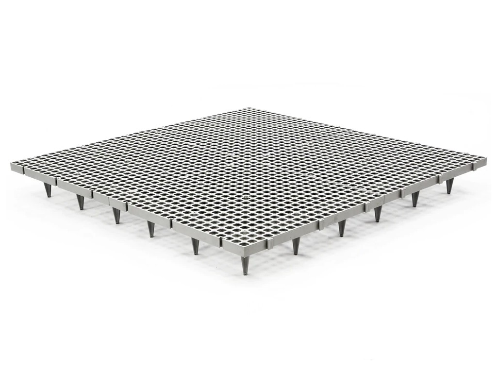 A láb nélküli padlórács (a lábak könnyen eltávolíthatók) nagyszerűen használható műanyag gyeplapokként is. A műanyag gyeplapok ideális megoldást kínálnak a füves terület megerősítésére.