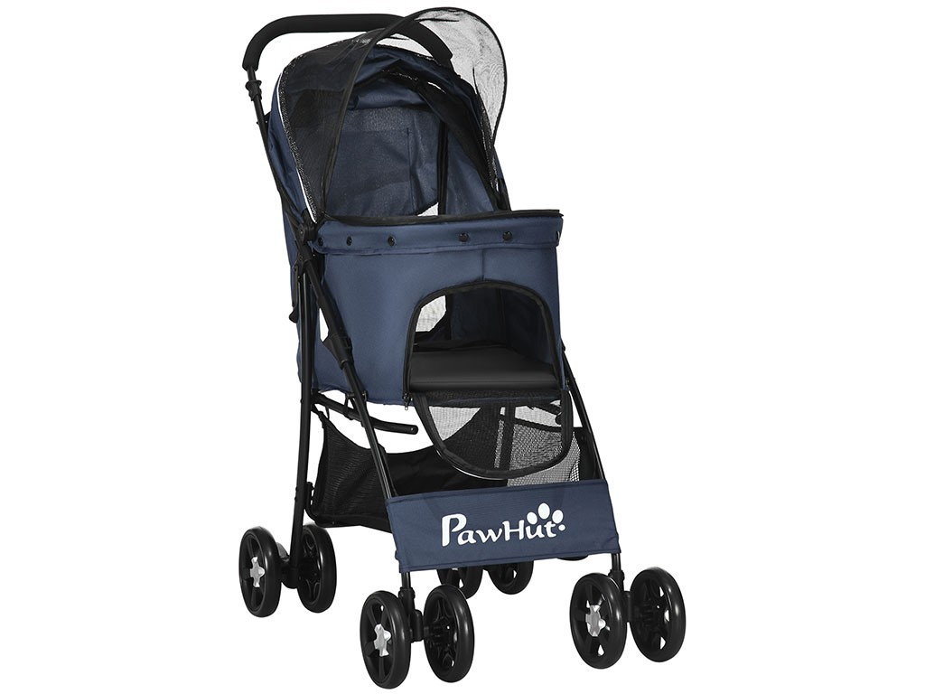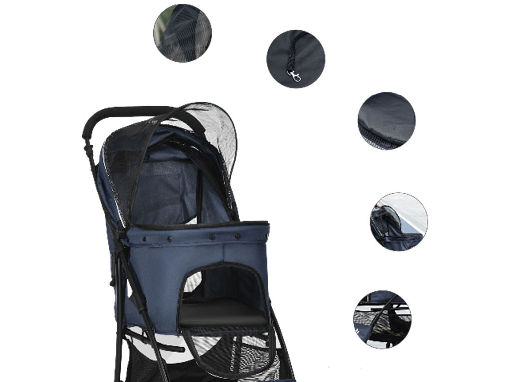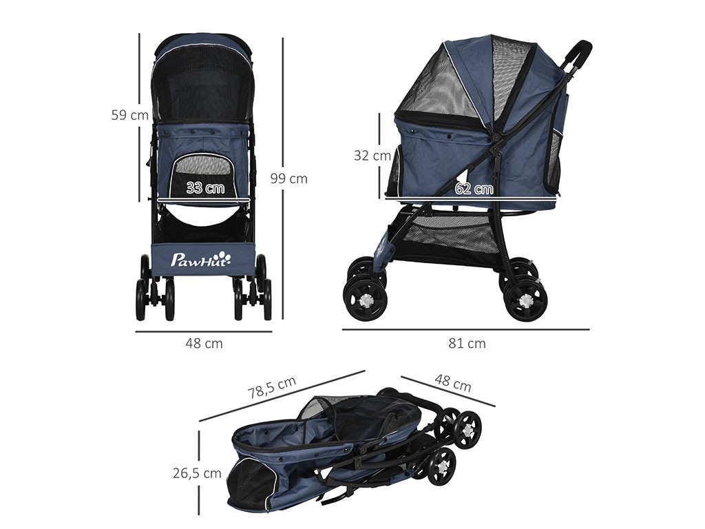 Babakocsi kutyáknak 10 kg-ig, acélváz, Oxford szövet huzat, első és hátsó hálós ablakok , összecsukható, 4 fokozatban állítható tető, hálós cipzáras ajtó , puha párna tartozék, 2 biztonsági póráz a kosárban, 2 univerzális első kerék, 2 fix hátsó kerék fékkel, kosár méretei tetővel 62x33x59cm, a babakocsi teljes méretei 81x48x99cm.