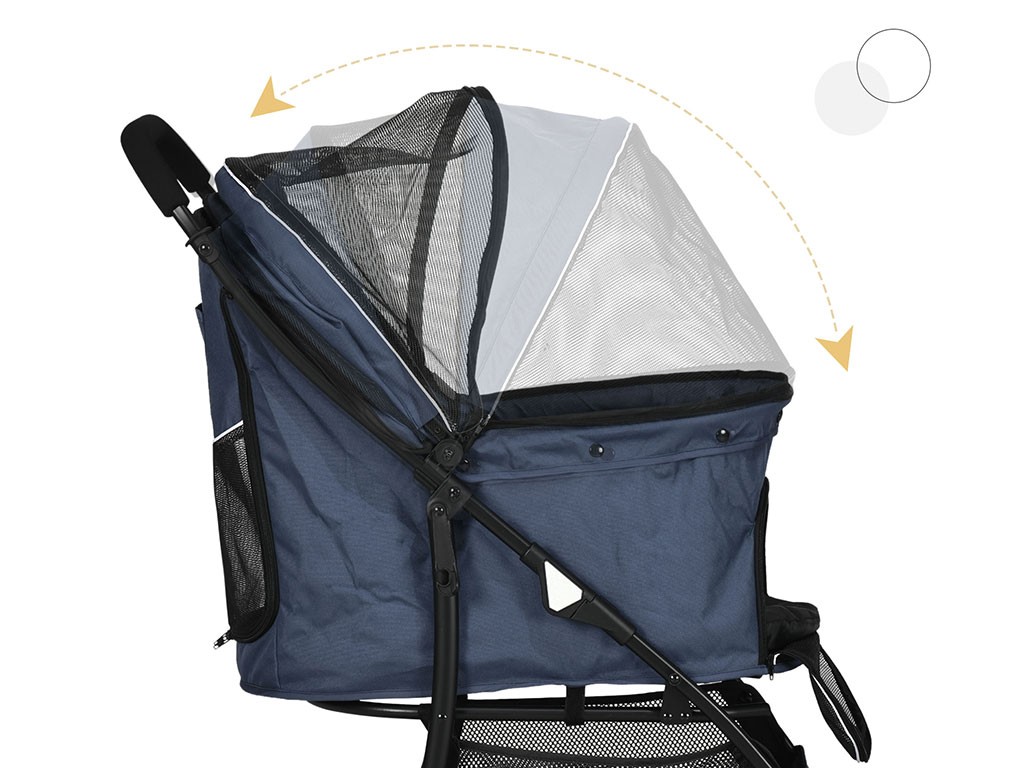 A babakocsi könnyen tárolható. Pillanatok alatt összecsukhatod és tárolhatod, vagy előkészítheted autós szállításra . Maga a kutyaszállító hordozó is összecsukható. Ha csak nagyszerű kilátást szeretnél biztosítani kutyádnak utazás közben, csak vedd ki és nyisd ki a 4 fokozatban összecsukható tetőt.