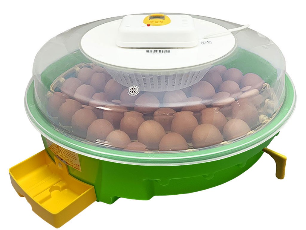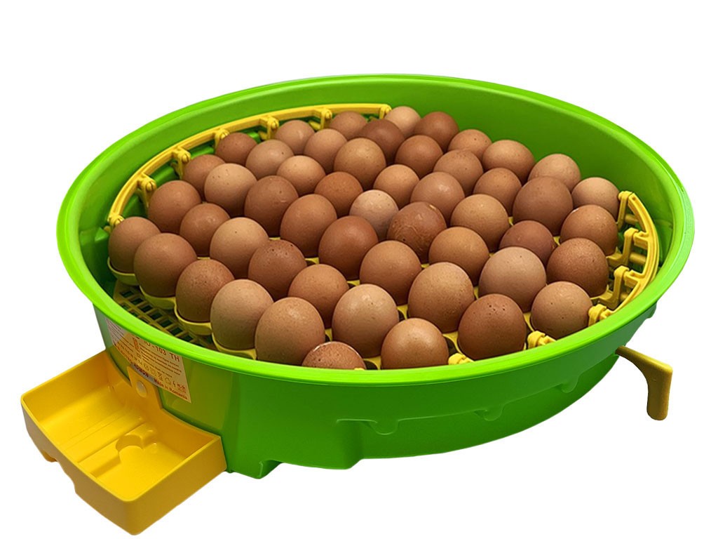 Vízimadár és baromfi keltetésére alkalmas tojáskeltető , félautomata forgatással, 51 tyúktojás kapacitással, a tojások manuális forgatásának lehetőségével, hőmérséklet-szabályozás nélkül, optimális értékre beállítva, manuális páratartalom-szabályozással, külső vízutántöltő tartállyal , hőmérővel, higrométerrel.