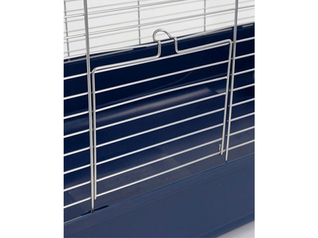 Kétszintes rágcsálóketrec , nyulak, tengerimalacok, csincsillák és más állatok számára, falétrán keresztül megközelíthető , tolóajtós szerkezet, bejárati ajtó minden szinten, felső ajtó a legfelső emeleten, két etető tartozék, sötétkék színű, rúdtávolság 2,2 cm, ketrec méretei 120x53x86 cm.