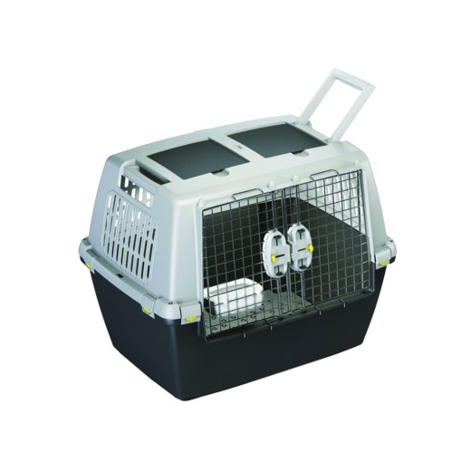 25-30 kg-os kutyák számára, a fedél és a kád klipszekkel van összekötve, sarkonként 4 csavar biztonsági zárként, dróttal ellátott dupla ajtó zárral, műanyag vízelvezető betét, kihúzható fogantyú a kennel húzásához , két tárolódoboz a tetőn, 500 ml-es tál kiömlésgátló szélekkel, belső méretek 74x51,5x51cm, külső méretek 80x58,5x62cm.