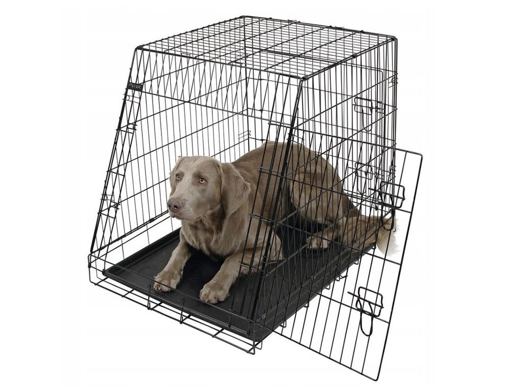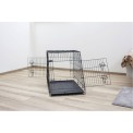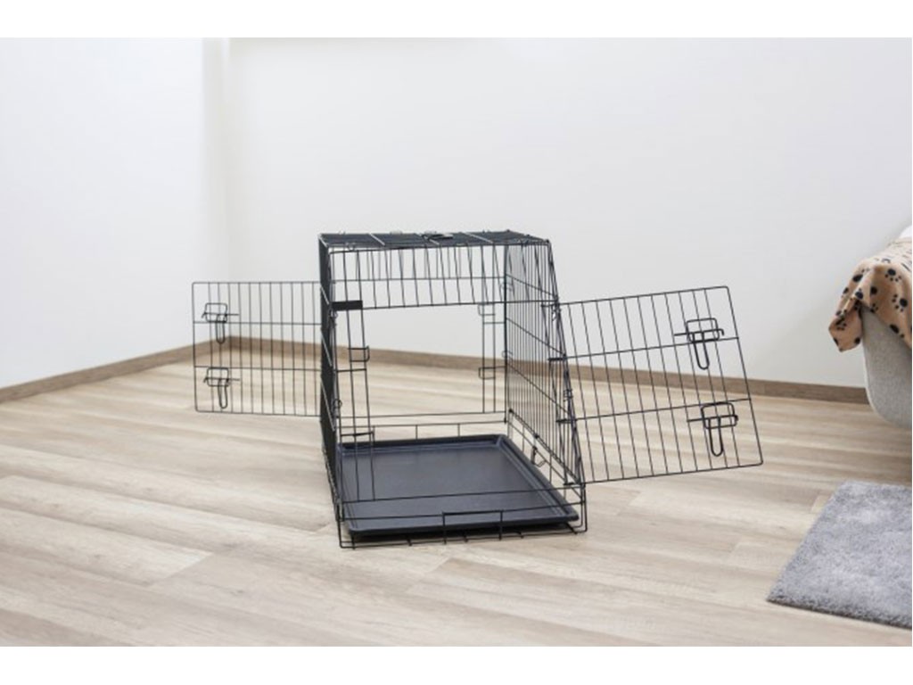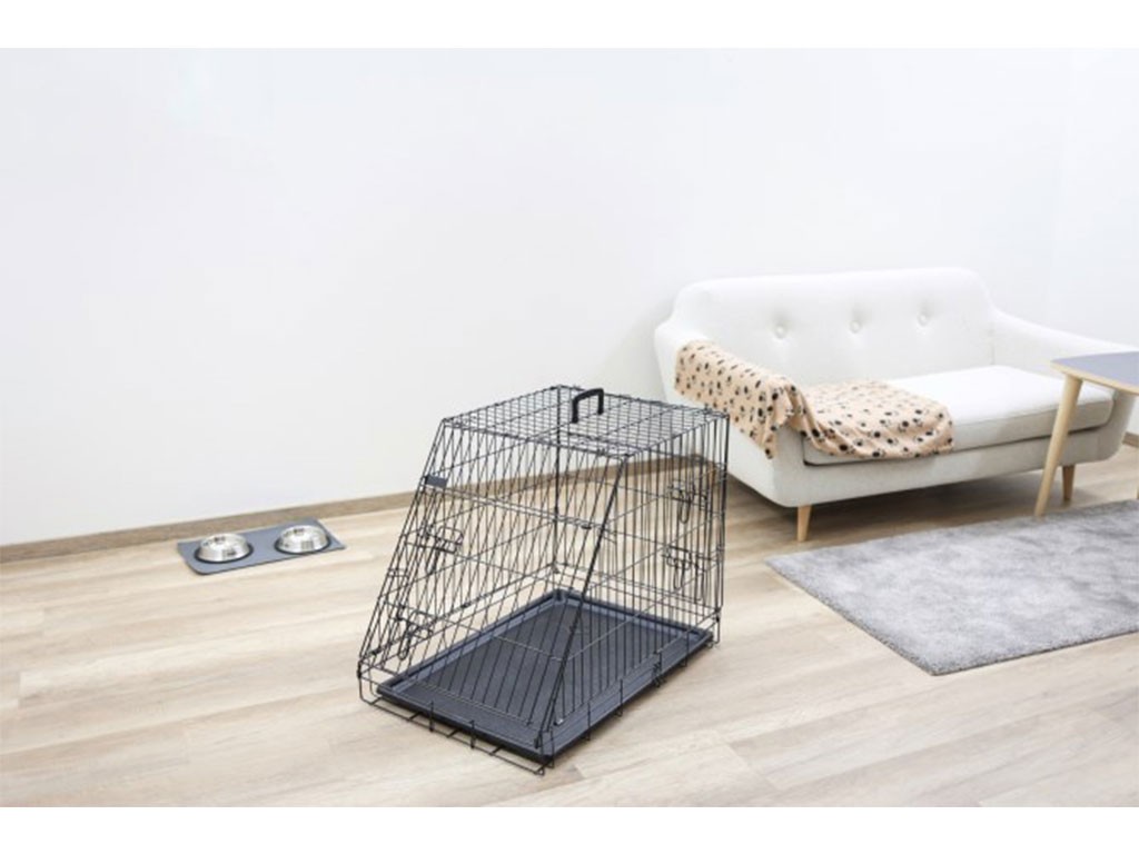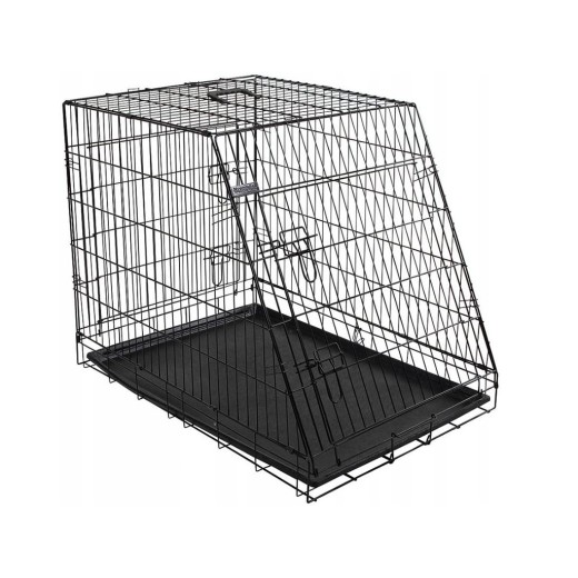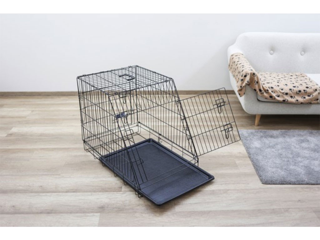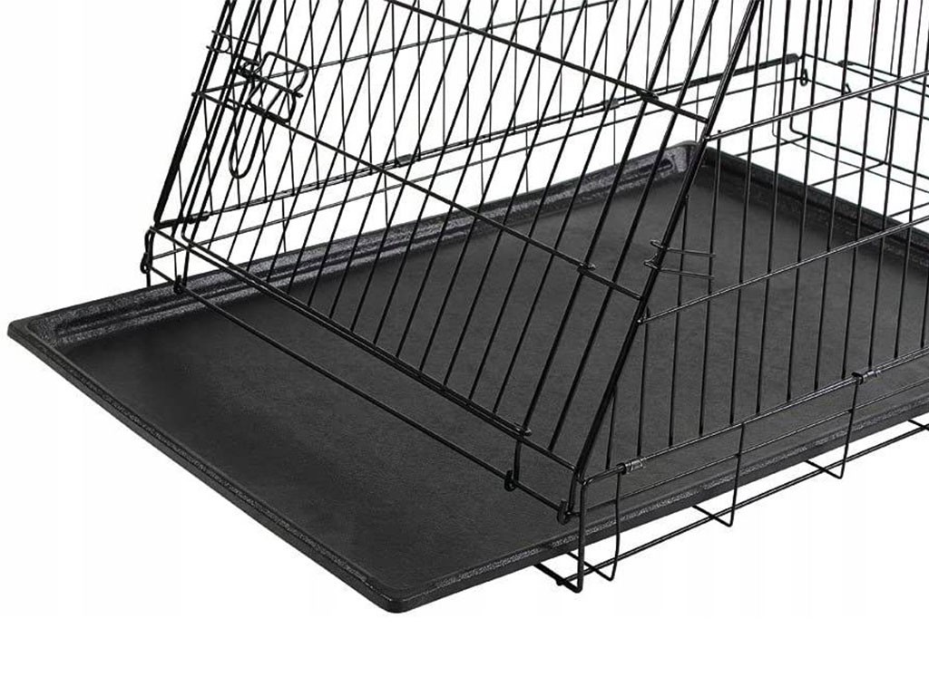 Kutyaszállító ketrec, kivehető műanyag tálcával, összecsukható, könnyen összeszerelhető és szétszerelhető , porszórt fém, két ajtó, elöl és hátul, fogantyú a könnyű hordozáshoz , ferde elülső rész az autó csomagtartójához, Méretek 75x52x61 cm.