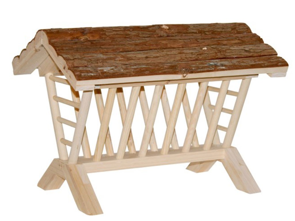 Természetes fából készült , etetővályú alakú szénajászol , védőtetővel , Ó Méretek 45x32x33 cm.