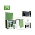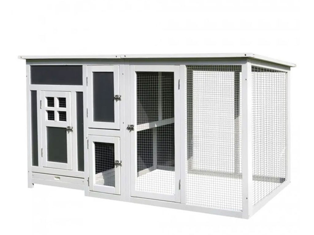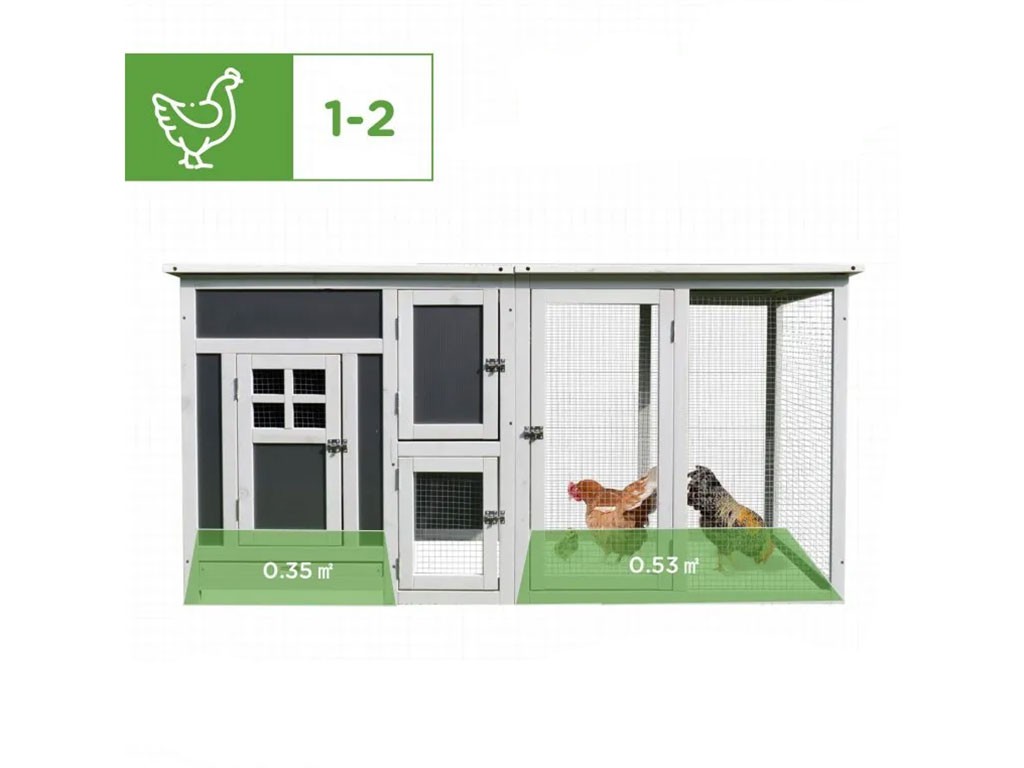 Fa tyúkól 1-2 tyúk számára, fenyőfából készült, zárható ajtóval , zsanéros, vízálló tetővel , 2 rekeszes tojófészekkel , fa és drótajtóval , kihúzható trágyatálca , méretek 160x80x75 cm.