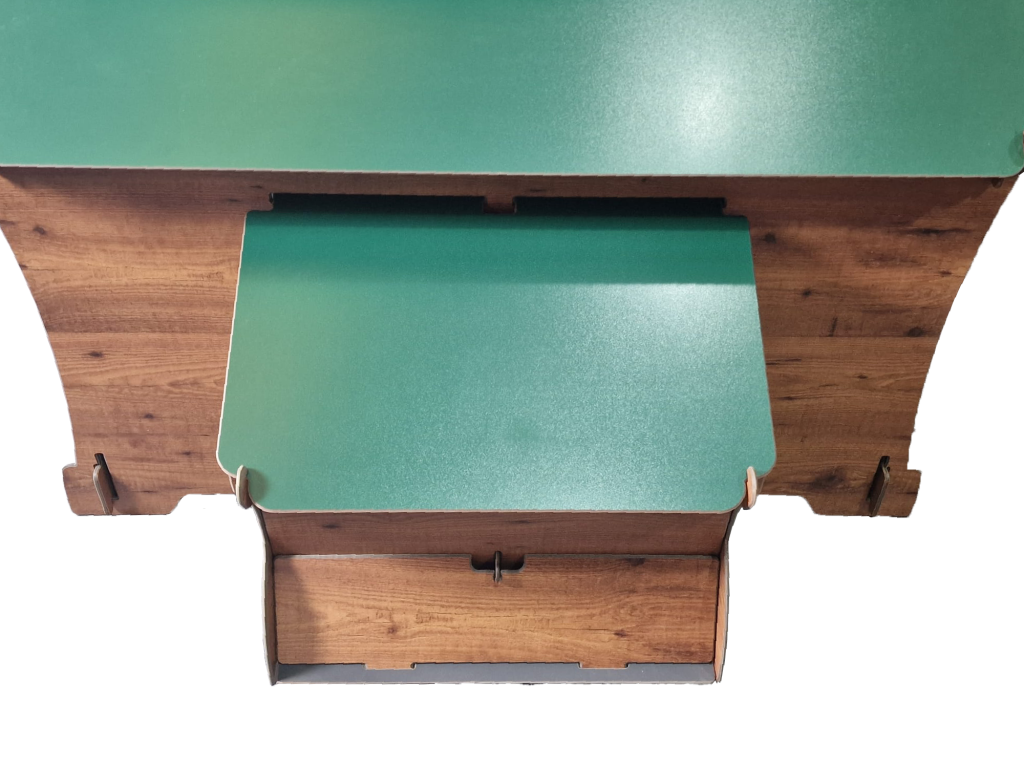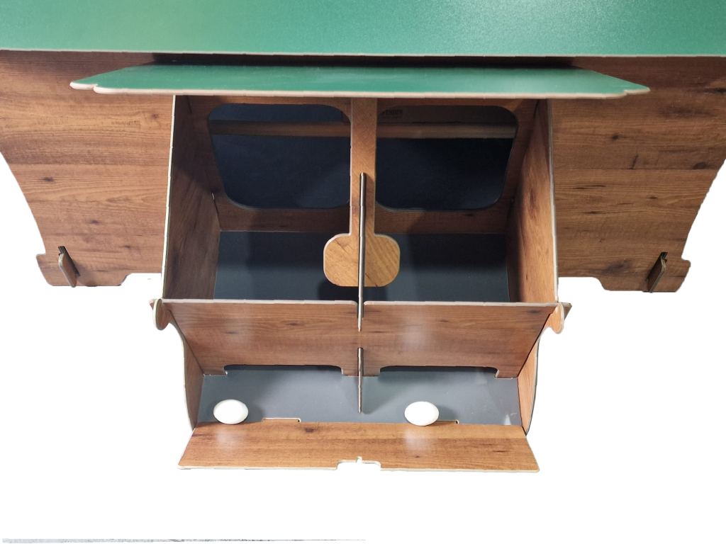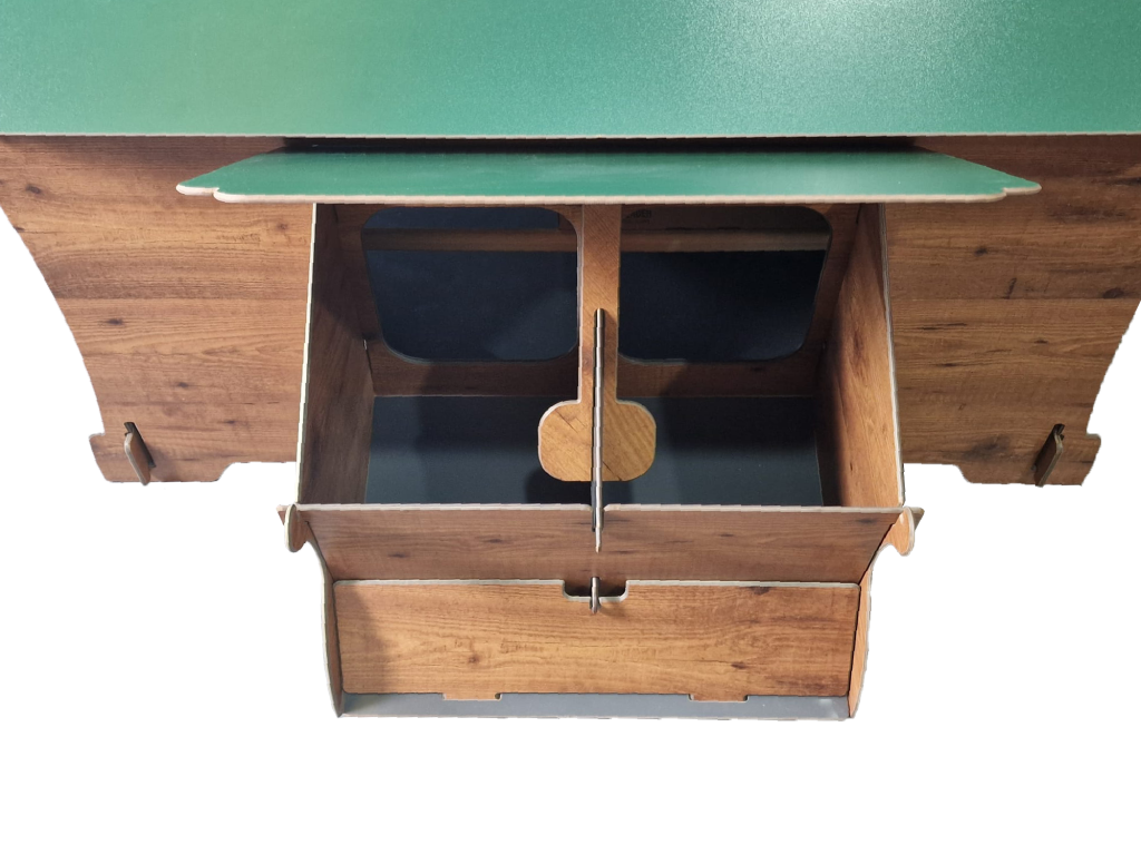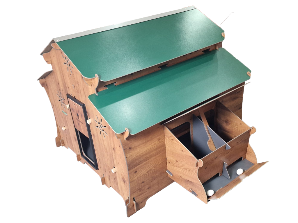 Tyúkól tyúkoknak , 24-28 tyúk tartására , kiváló minőségű HPL laminált anyagból készült, 4 külső tojófészekkel , 4 ülőrudakkal, csuklós tetővel, méretek 155x140x125 cm.