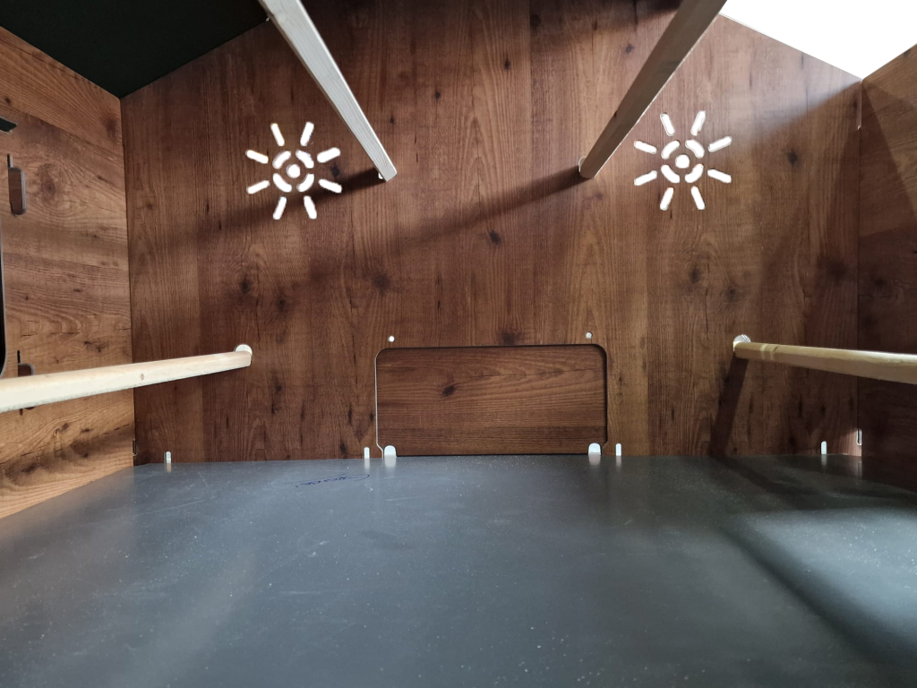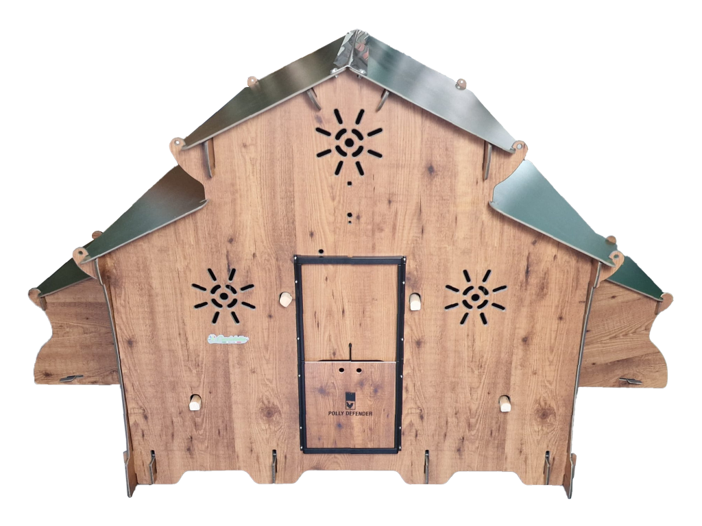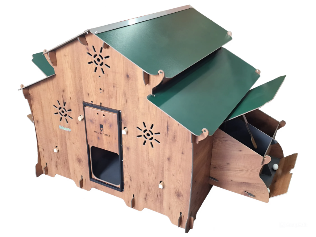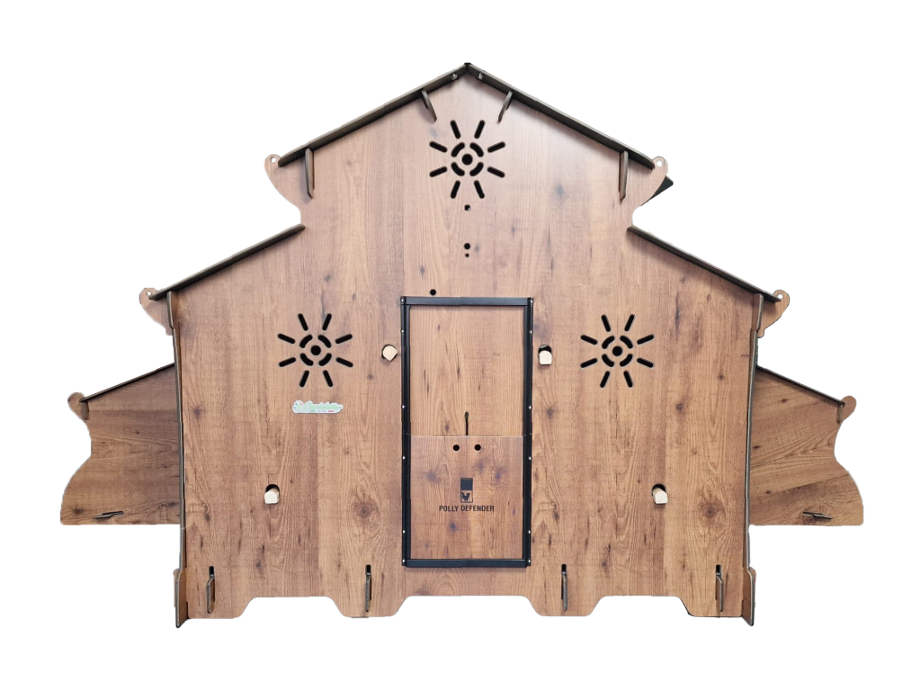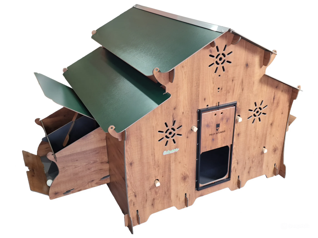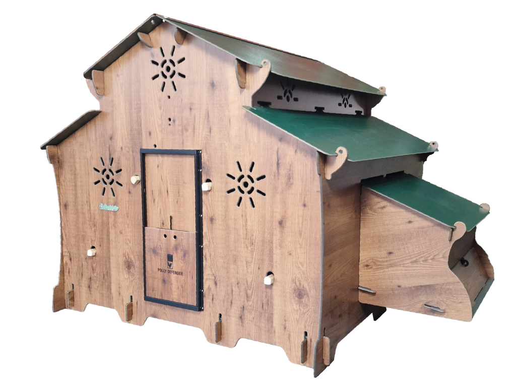 A tyúkól négy ülőrudával van felszerelve, hogy a tyúkok éjszaka pihenhessenek . A tyúkól négy külső ülőhellyel is rendelkezik, ahol a tyúkoknak elegendő helyük és nyugalmuk lesz a tojásrakáshoz. A tojások begyűjtése nagyon egyszerű lesz, mert a felvételükhöz csak a tojófészkek tetejét kell felemelni . A csomag tartalmaz egy Polly Defender biztonsági ajtót , amelyhez könnyen csatlakoztathatja a tyúkól automatikus nyitását, ha érdekli. A tyúkól automatikus nyitása és zárása nem része a csomagnak! Ezenkívül a tyúkól 140 cm hosszú rozsdamentes acél tetőgerinccel és a rögzítéséhez szükséges tartozékokkal van felszerelve .