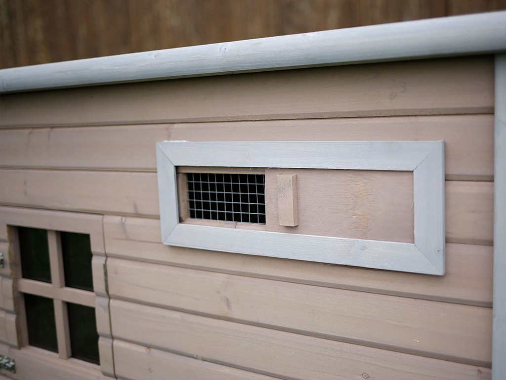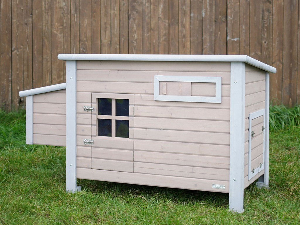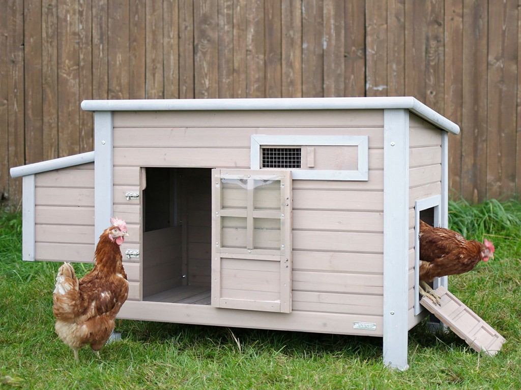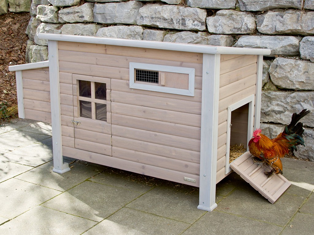 A fenyőfából készült tyúkól súlya körülbelül 34 kg, ami nagyfokú stabilitást biztosít . A tyúkól nincs szigetelve. A napfény elleni védelem érdekében a tyúkól tetejét és a tojófészkeket aszfalt tetőfedéssel borítjuk . Javasoljuk azonban, hogy a tyúkólat fedél alá helyezzék , hogy megvédjék az esőtől, hótól és az extrém napsütéstől. A fa tyúkól alapvédő bevonattal van ellátva. A hosszabb élettartam érdekében a védőbevonatot, mint minden fa esetében, meg kell újítani. A tyúkólban a légáramlást egy elülső tolóablak biztosítja .