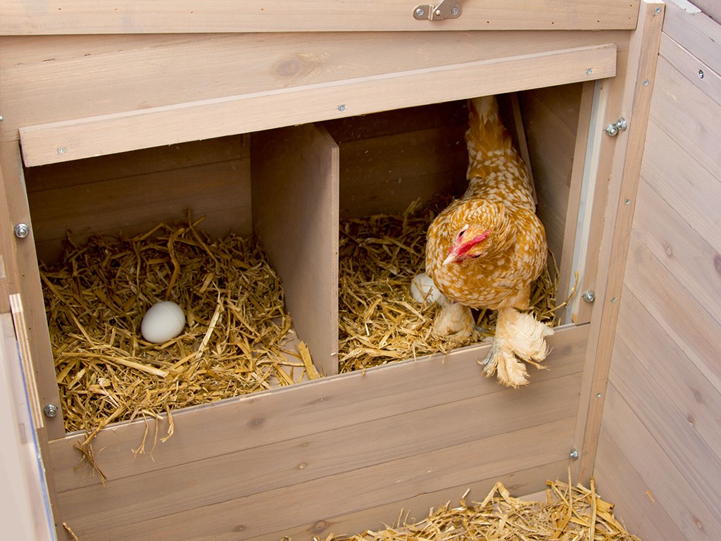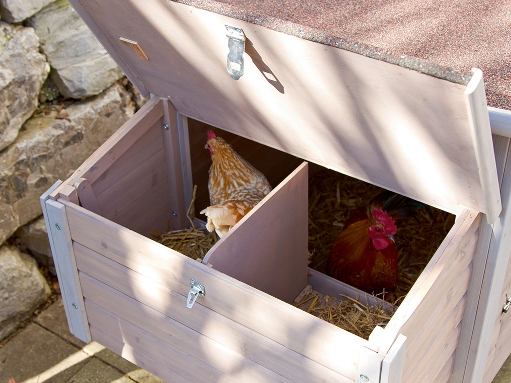 A tyúkól két ülőrudakkal van felszerelve, hogy a tyúkok éjszaka pihenhessenek . Az ól két külső ülőhellyel is rendelkezik, ahol a tyúkoknak elegendő helyük és nyugalmuk lesz a tojásrakáshoz. A tojások begyűjtése nagyon egyszerű lesz, mivel csak a tojófészkek tetejét kell felemelni a begyűjtéshez .