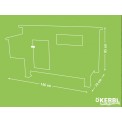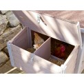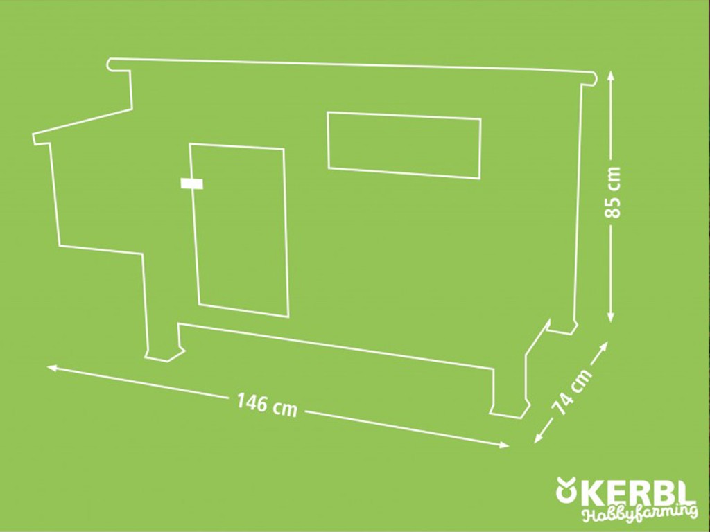 A csirkeól külső méretei 146 x 74 x 85 cm. és így akár 6 klasszikus tojótyúk számára is kényelmet biztosít.