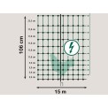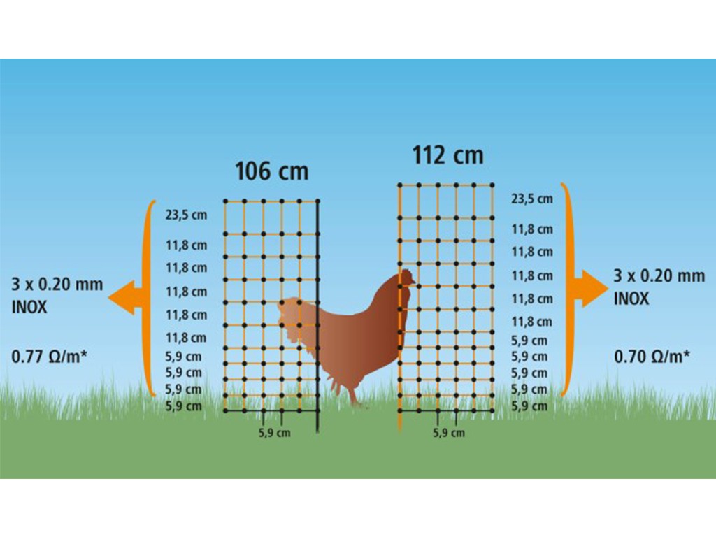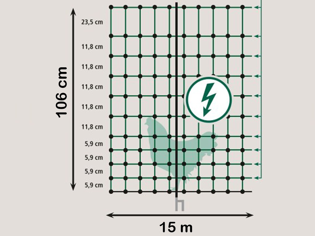 Baromfikerítéshez való, 106 cm magas és 15 m hosszú , elektromos kerítés építésére alkalmas vezetőképes háló. A csomag 6 db dupla végű, tömör műanyag rudat és 4 db rögzítőhorgot tartalmaz. Ez egy védőháló, amely megakadályozza a tyúkok vagy bárányok szökését , és egyúttal megvédi őket a ragadozóktól .