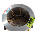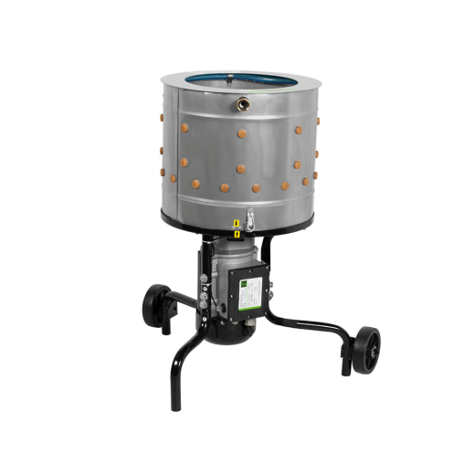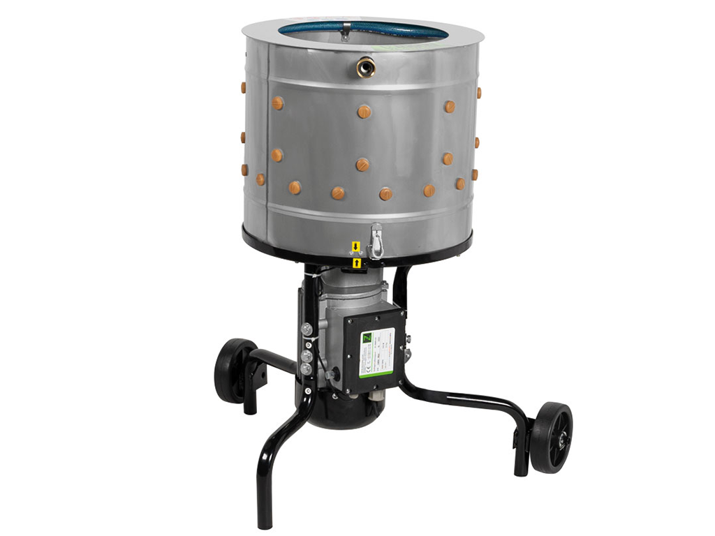 Rozsdamentes acél dobos baromfikoptató, max. kapacitás 5 kg, öblítőgyűrű a tollmosáshoz, karbantartásmentes motor 550 W teljesítménnyel , 250 fordulat/perc fordulatszám, 114 kopasztóujj , egyszerű és gyors tisztítás, golyóscsapágyas gumikerekek , dobmagasság 350 mm x dob Ø 400 mm, dobnyílás Ø 285 mm, kopasztó méretei: 702x509x778 mm.